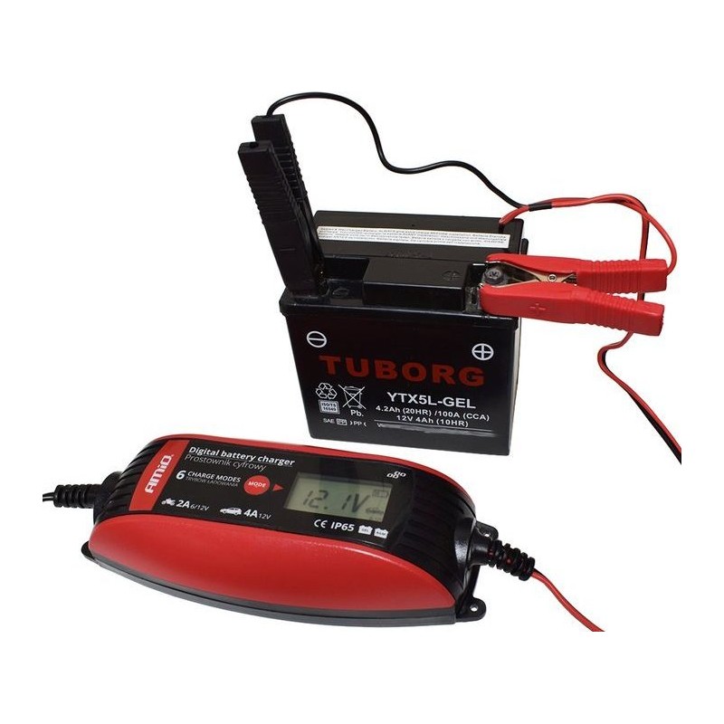 Akumulatory żelowe o pojemności do 14Ah stosowane w motocyklach i skuterach należy ładować wybierając program z ikoną motocykla na wyświetlaczu.