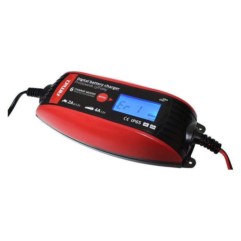 - Sygnalizuje stan naładowania, parametry ładowania oraz błędne podłączenie do akumulatora.
