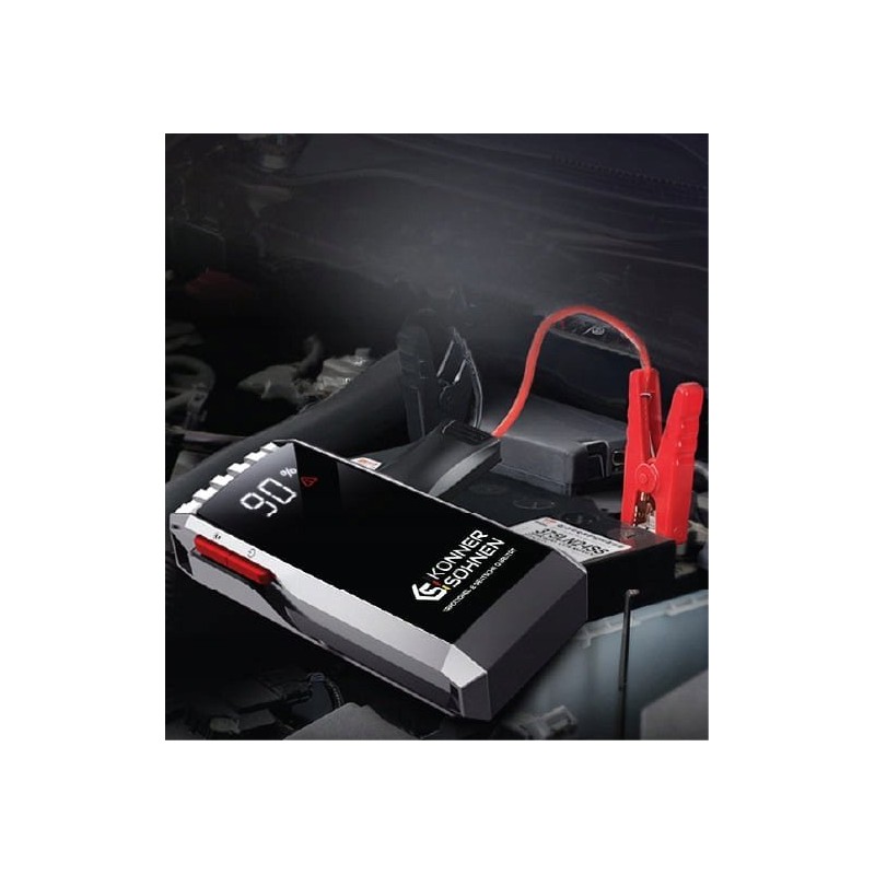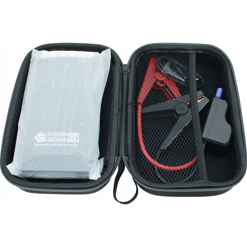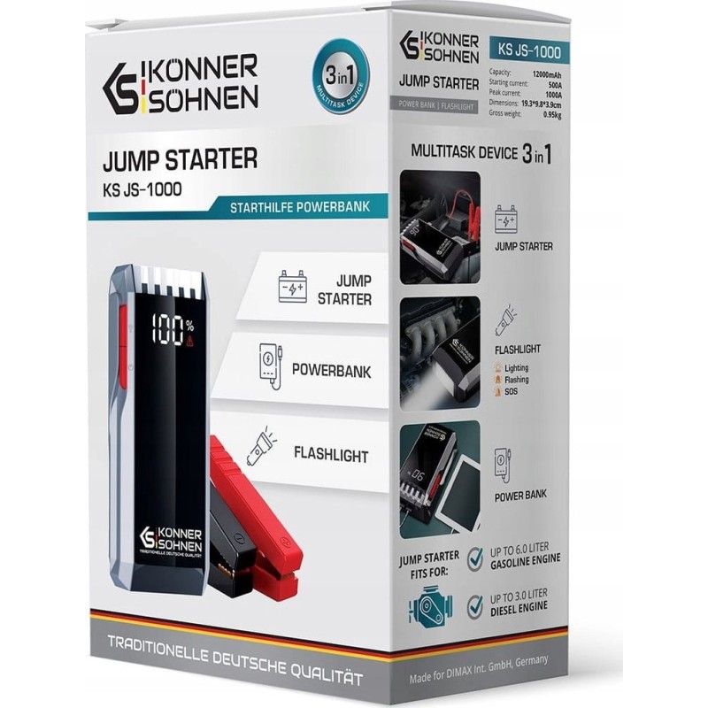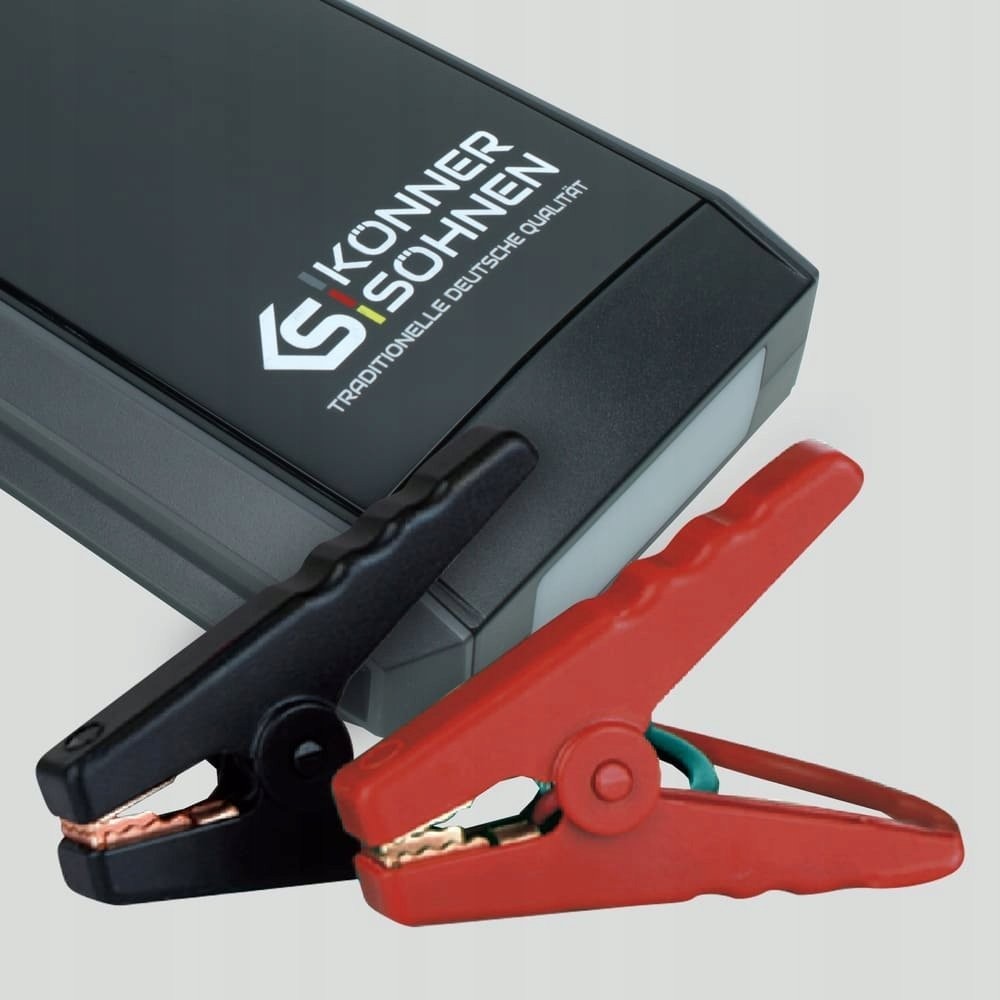 Starter samochodu KS JS-1000 jest niezastąpiony w przypadku, gdy akumulator samochodu jest rozładowany lub jego pojemność nie wystarcza do uruchomienia silnika, co jest szczególnie istotne w chłodne dni. Wyposażony jest w najnowocześniejszy akumulator litowo-jonowy wysokiej jakości o pojemności 12000 mAh o wysokim prądzie rozruchowym do 1000 A, który umożliwia uruchomienie pojazdów z silnikami benzynowymi do 6 litrów i silnikami diesla do 3 litrów w ciągu kilku sekund. Zaciski posiadają dodatkowe połączenie płyt mocujących za pomocą przewodu, co zwiększa powierzchnię mocowania i zmniejsza opór podczas przenoszenia energii.