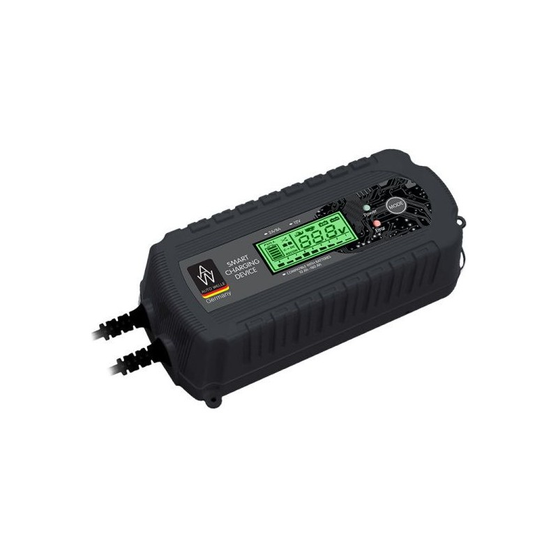 Napięcie, V – 12 Natężenie – 2 A / 8 A Maksymalna pojemność A/h – 160 W pełni zautomatyzowany cykl ładowania. Zabezpieczenie przed zwarciem. Zabezpieczenie przed zmianą biegunowości. Zabezpieczenie przed przegrzaniem. Ochrona przed iskrami. Wyświetlacz LCD. .Prostowniki AUTO WELLE przeznaczone są do wszystkich typów akumulatorów rozruchowych,. takich jak kwasowo-ołowiowe, . AGM czy żelowe, . używanych w samochodach osobowych, . małych samochodach dostawczych, . motocyklach oraz innych pojazdach i mechanizmach. . Wbudowany mikroprocesor zapewnia maksymalne bezpieczeństwo poprzez automatyczne ładowanie. . Zabezpiecza przed zwarciem, nieprawidłową polaryzacją, przegrzaniem akumulatora i prostownika. . Chroni przed iskrami, podczas gdy prostownik jest podłączony i w momencie jego odłączania..Wyświetlacz LCD zapewnia wygodne korzystanie z prostownika w dowolnym momencie. .