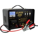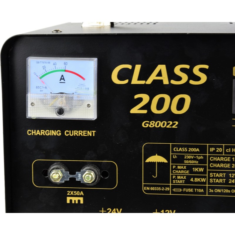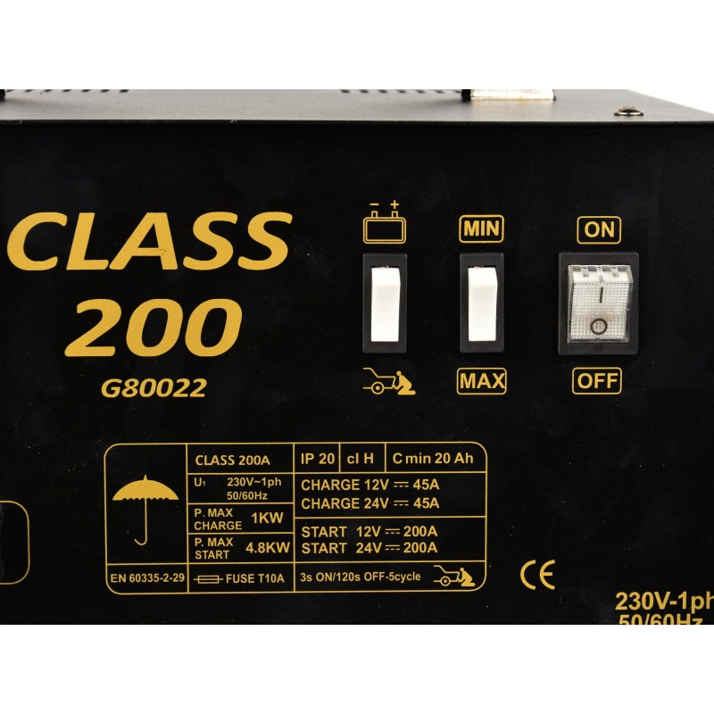 Prostownik z rozruchem 200A do akumulatorów 12V / 24V Urządzenie rozruchowe serii Class 200 przeznaczone jest do wspomagania rozruchu oraz ładowania akumulatorów ołowiowo-kwasowych o napięciu 12V lub 24V, stosowanych m. in. w samochodach ciężarowych oraz maszynach budowlanych, a także do rozruchu silników spalinowych w przypadku całkowitego rozładowania akumulatora lub bardzo niskich temperatur otoczenia. Prostownik wyposażony został w wyłącznik termiczny, który w momencie przegrzania się transformatora wyłącza układ. Doskonale sprawdzi się przy wspomaganiu rozruchu pojazdów z silnikami benzynowymi oraz diesla, takich jak samochody ciężarowe, dostawcze, maszyny rolnicze itp. Charakterystyka produktu: ergonomiczny uchwyt do przenoszenia umożliwia rozruch silników przy całkowicie rozładowanym akumulatorze ładuje akumulatory o pojemności od 20 do 400 Ah napięcie ładowania 12V / 24V Specyfikacja techniczna: Napięcie zasilające: 230V, 50 Hz Napięcie ładowania: 12 / 24V Prąd ładowania: 45 A Prąd rozruchu: 200 A Bezpiecznik: 2x50 A Pojemność obsługiwanych akumulatorów: 20 - 400 Ah Długość przewodów prostowniczych: 167 cm Długość przewodu zasilającego: 173 cm