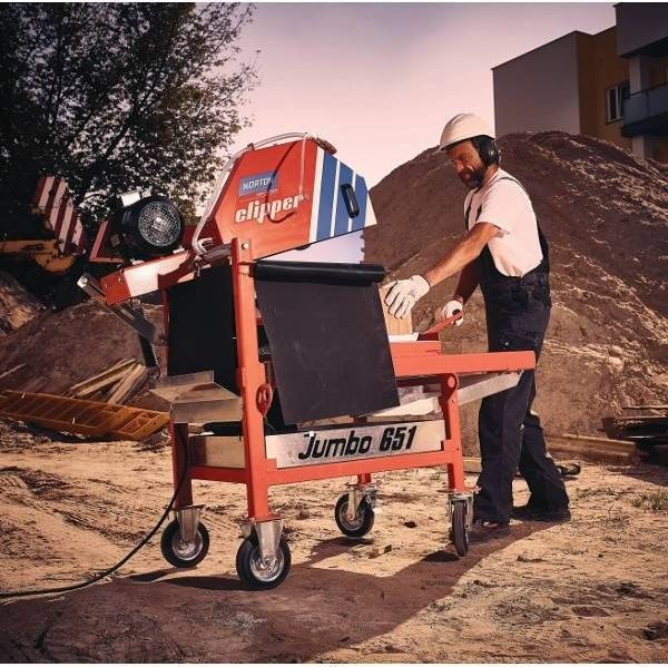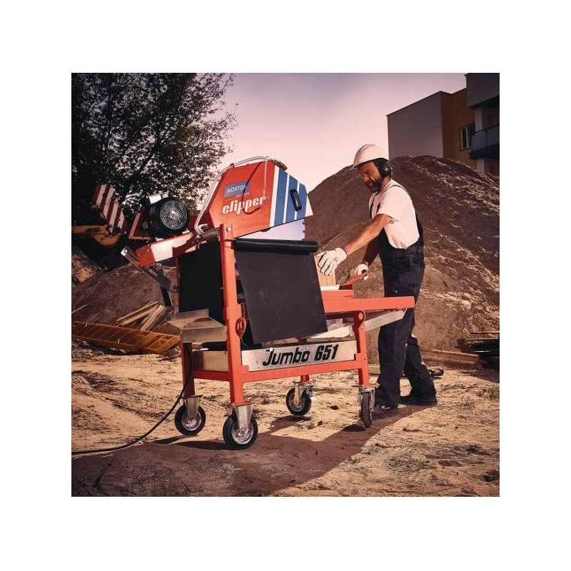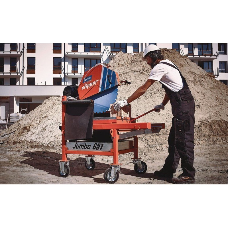 NORTON JUMBO 651 1.30.3 jest mocną i silną przecinarką stolikową NORTON Clipper do cięcia dużych cegieł i bloków. Znakomicie sprawdza się do pracy na budowie.Idealna na placu budowy do cięcia materiałów budowlanych np. porotherm, silka, płyty betonowe itp