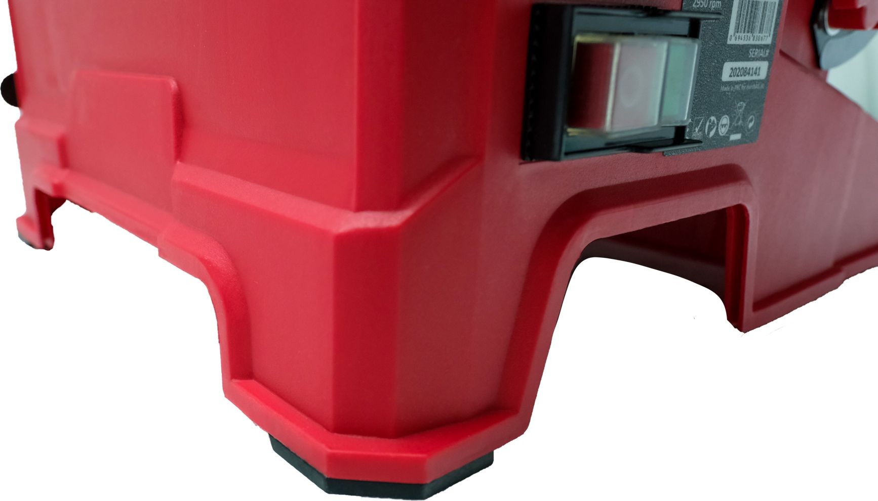 Stół przecinarki wykonano z wysokiej jakości, grubej stali o zwiększonej wytrzymałości gwarantujący stabilność podczas pracy a antypoślizgowe wykończenie zapobiega przesuwaniu się obrabianego materiału.