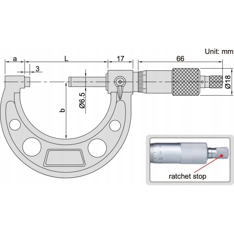 - Wrzeciono: fi 6,5 mm, skok gwintu mikrometrycznego 0,5 mm