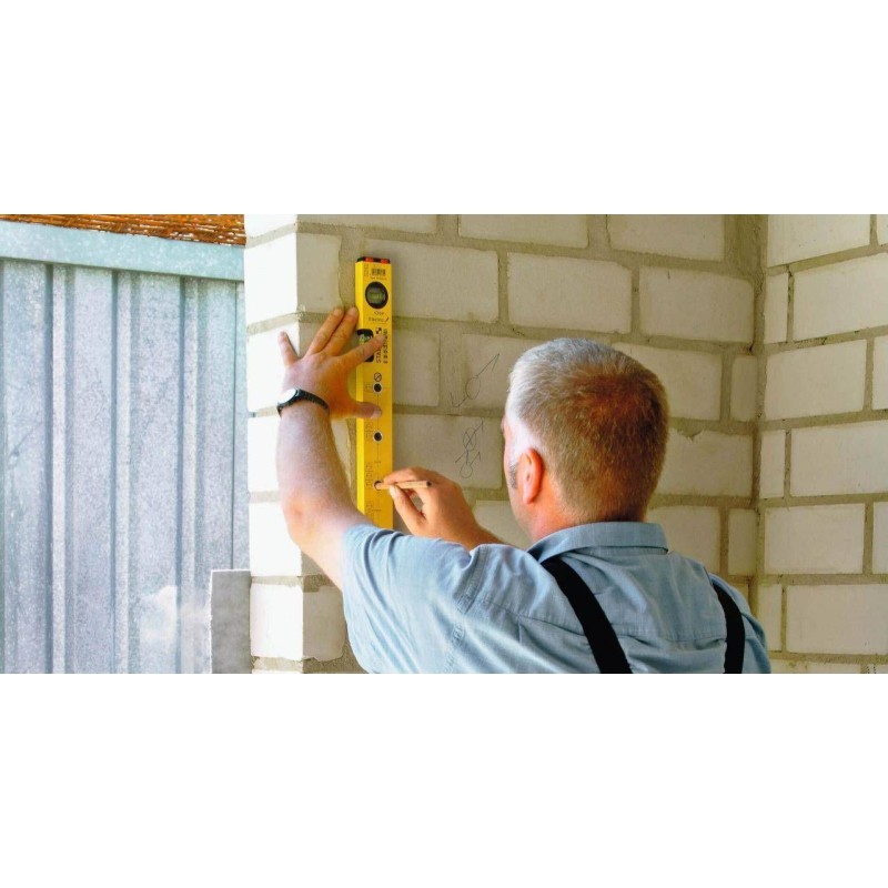 - Długość 120 cm z dodatkowymi przydatnymi znacznikami, np. wysokością gniazd wtyczkowych blatu kuchennego (1150 mm), wysokością wyłączników (1050 mm), wysokością gniazd wtyczkowych (300 mm), znacznikiem poziomu.