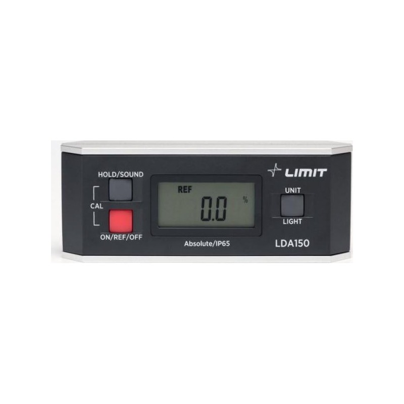 Cyfrowa poziomnica i kątomierz Limit w klasie IP65. Od spodu magnes i rowek pryzmatyczny. „0” może być ustawione w dowolnej pozycji. Funkcja pomiaru bezwzględnego pozwala wybierać czy wyświetlana ma być wartość odchyłki od 0 rzeczywistego, czy też od innego położenia przyjętego za 0. Wynik pomiaru można zatrzymać na wyświetlaczu w żądanej pozycji. Automatyczne wyłączanie. Baterie typu LR03, załączone 2 szt.