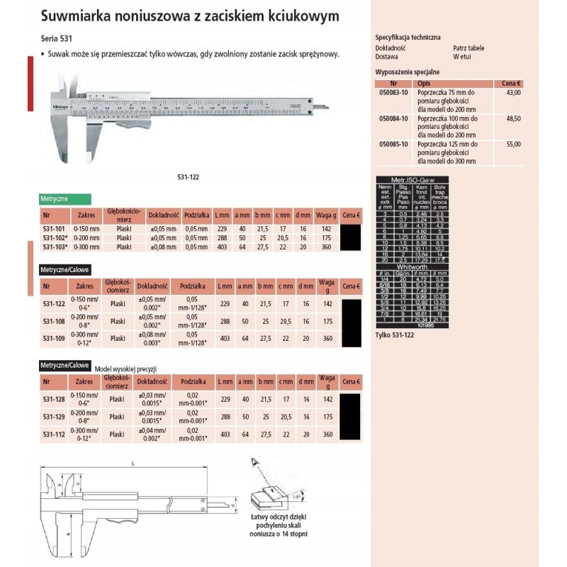 Specyfikacja techniczna suwmiarki Mitutoyo 531-122