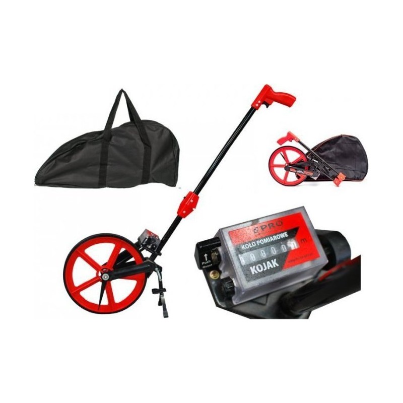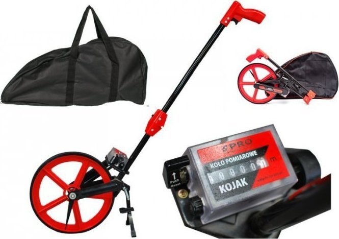 KOJAK to doskonale zaprojektowane i wykonane koło pomiarowe przystosowane do użytku w różnorakim terenie:   * na budowie   * w domu   * w drogówce   * na działce.  Licznik: sześciocyfrowy, wysokość cyfr 6 mm  Waga: 2 kg  Wielkość po rozłożeniu: 1,12 m  Wielkość po złożeniu: 0,62 m  Średnica koła: 32 cm  Materiał:  opona czarna  obudowa licznika ze stali nierdzewnej  spust ze stali  widełki i nóżki stojaka ze stali węglowej  Zasięg pomiarowy: 99 999,9 m  ...