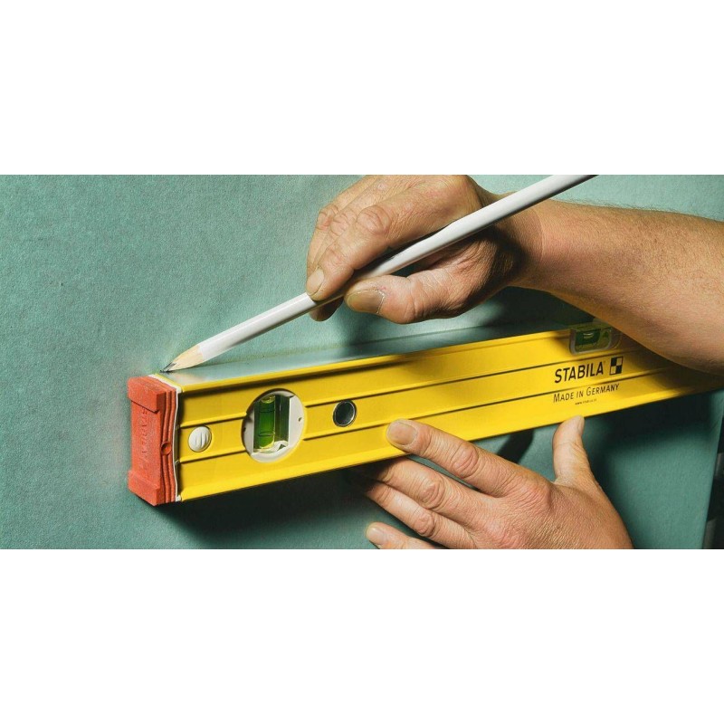 Na budowie poziomnica jest silnie obciążana, często może się też zdarzyć, że spadnie. Dlatego tym bardziej istotne jest, aby nawet poddawana codziennym obciążeniom zapewniała równie dokładny pomiar jak pierwszego dnia. Dwie libelle pionowe umożliwiają odczyt w każdej pozycji. Wytrzymały, wzmacniany profil prostokątny z aluminium oraz technologia montażu STABILA z zalewaną na stałe libellą sprawiają, że urządzenie to staje się perfekcyjnym partnerem w trudnych zadaniach budowlanych. Poziomnice firmy STABILA: precyzja na całe życie.