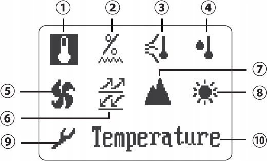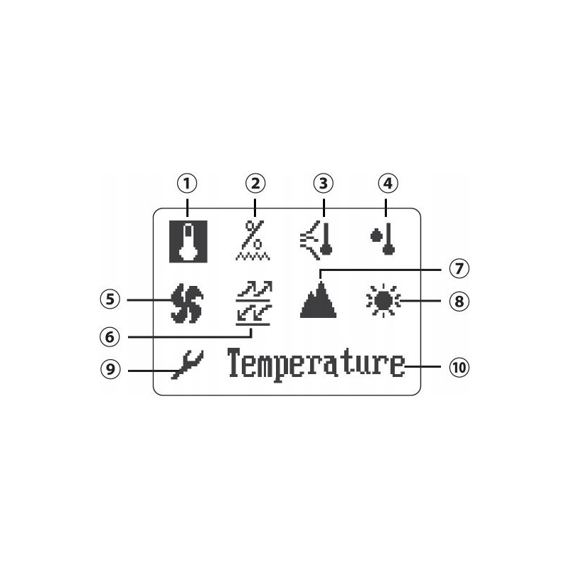 - Opcje pomiaru: mierzenie wartości temperatury, wilgotności, odczucia chłodu, punktu rosy, prędkości wiatru, ciśnienia barometrycznego, wysokości i oświetlenia;