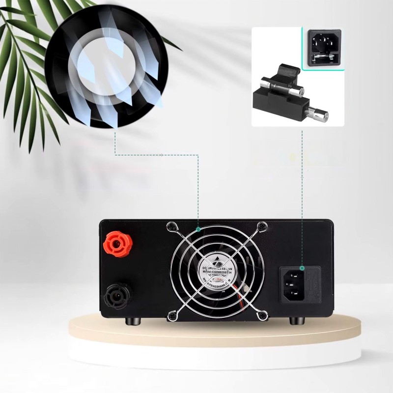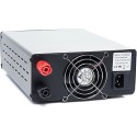 Urządzenie charakteryzuje się solidną metalową obudową oraz gumowymi nóżkami, co zapewnia stabilność na blatach warsztatowych. Zasilacz jest chłodzony cichym wentylatorem, który automatycznie uruchamia się w przypadku wzrostu temperatury, co pozwala na długotrwałą pracę bez ryzyka przegrzania.