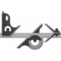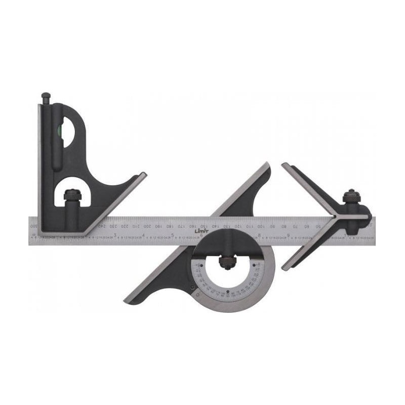 Wykonany ze stali węglowej, z elementami regulacyjnymi ze stali nierdzewnej. Z kątomierzem tarczowym, przykładnią kątową i głowicą środkującą. Wszystkie części są przesuwane na liniale z podziałką. Ampułka poziomowania na tarczy kątomierza i przykładni kątowej. Podziałka na liniale w mm i calach....
