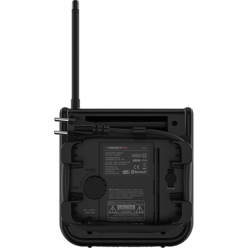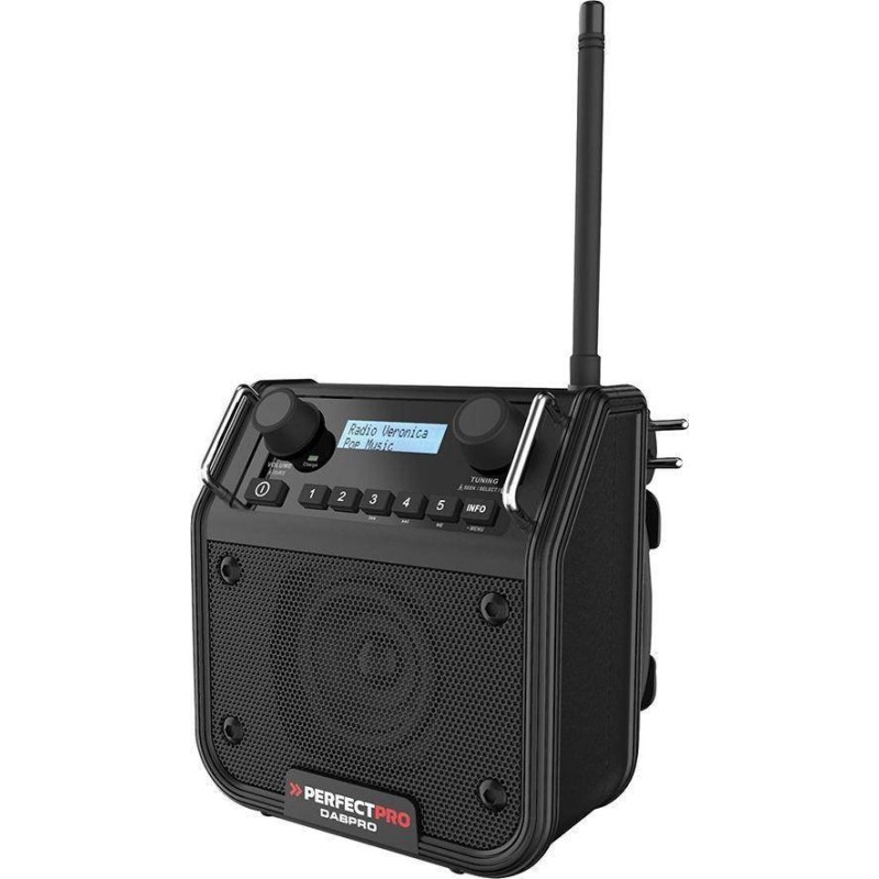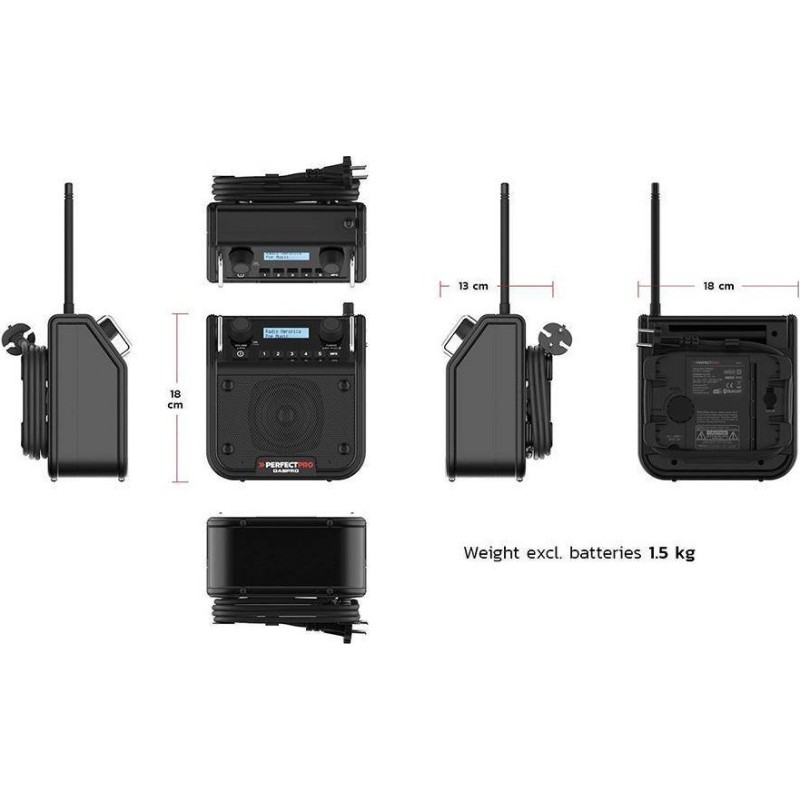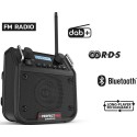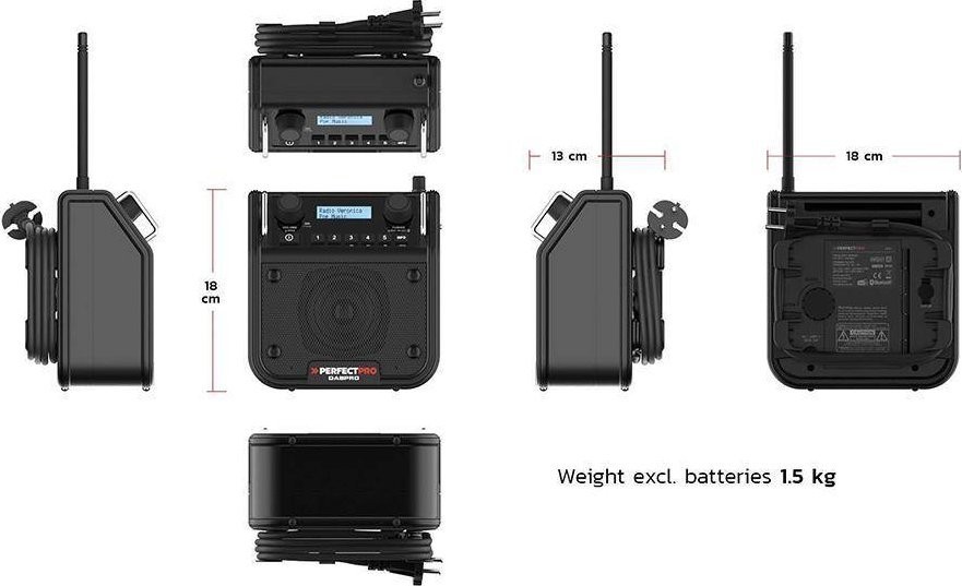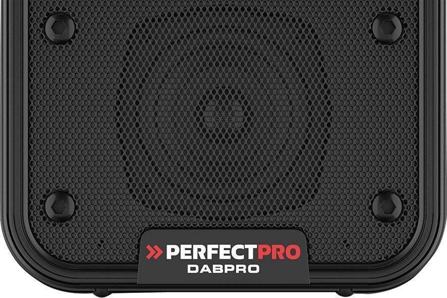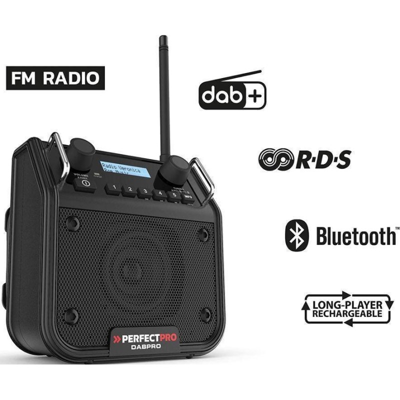 Radio budowlane DABPRO •radio cyfrowe DAB+ •radio UKW •5 stacji do zaprogramowania dla radia UKW •wejście Aux do podłączenia zewnętrznego odtwarzacza MP3 •odbiornik Bluetooth do strumieniowej transmisji muzyki •głośnik 3" 4 W •zasilanie sieciowe (230V) i baterie (4 x C) •menu sterowania może być ustawione w kilku językach •obudowa wykonana z odpornego na uderzenia tworzywa ABS •kabel zasilający 1,8 m z gumy neoprenowej •schowek na kabel z tyłu radia •elastyczna, składana antena (typ RADAB7) •metalowy wspornik ochronny dla przycisków obrotowych •podświetlany wyświetlacz LCD •metalowa maskownica głośnika •odporność na deszcz, zanieczyszczenia i kurz (IP54)