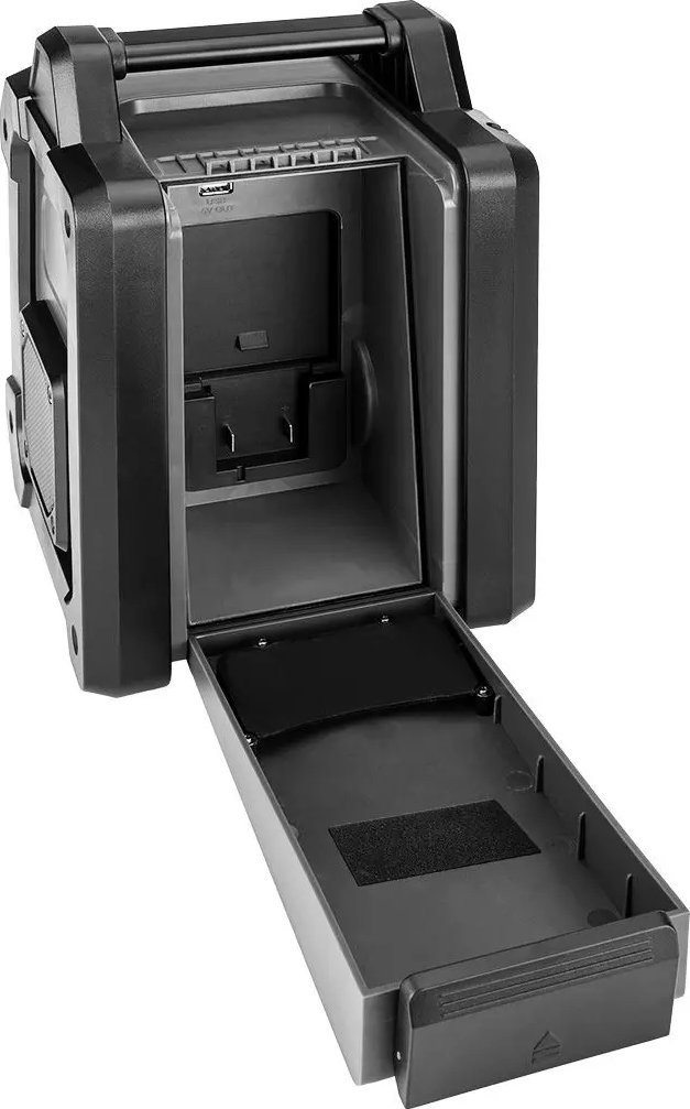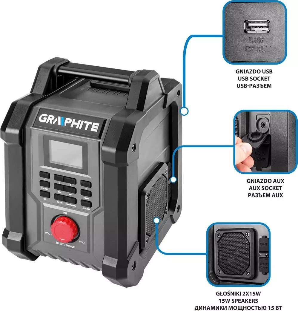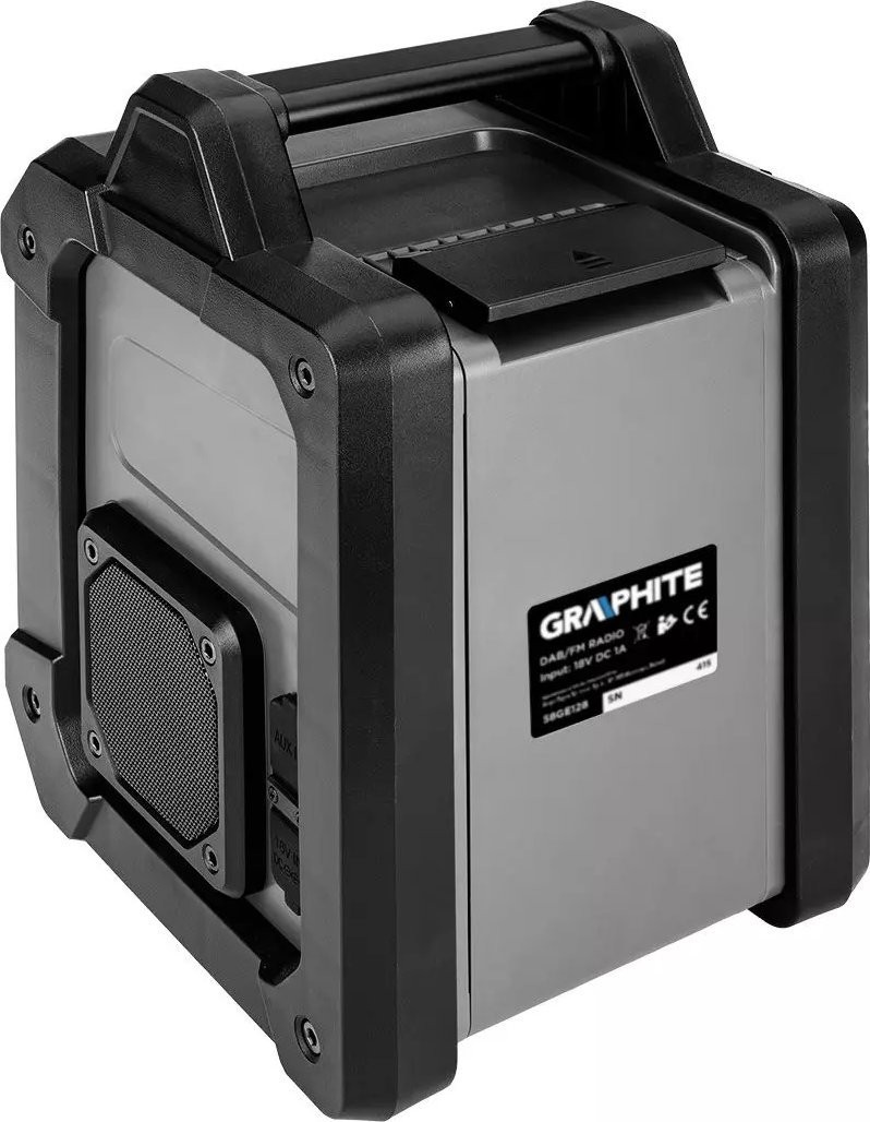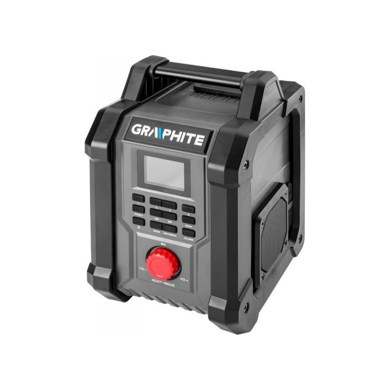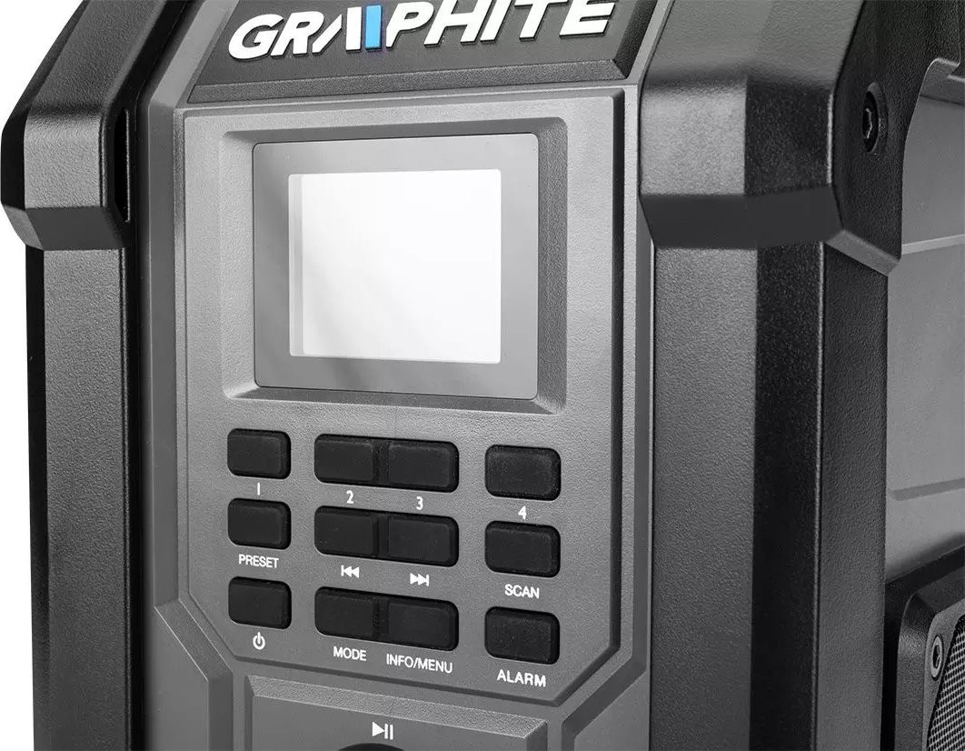 Niezwykle wytrzymałe radio budowlane marki GRAPHITE posiadające zasilanie sieciowe oraz akumulatorowe jednocześnie. Należy do rodziny produktów Energy +, które funkcjonują w oparciu o wydajne akumulatory litowo-jonowe 18 V. Radio posiada zestaw dwóch głośników – każde o imponującej mocy 15 W. Wbudowany praktyczny, kolorowy ekran 2,4 cala wyświetla aktualną częstotliwość (urządzenie pozwala na obsługiwanie funkcji FM w zakresie od 87,5 do 108 mHz oraz DAB w zakresie 174 – 240 mHz). Łącznie ma do zaoferowania około 60 stacji!