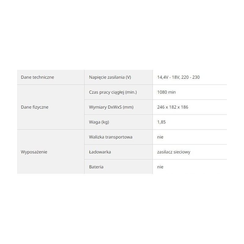 - Napięcie zasilania (V): 14,4V - 18V, 220 - 230