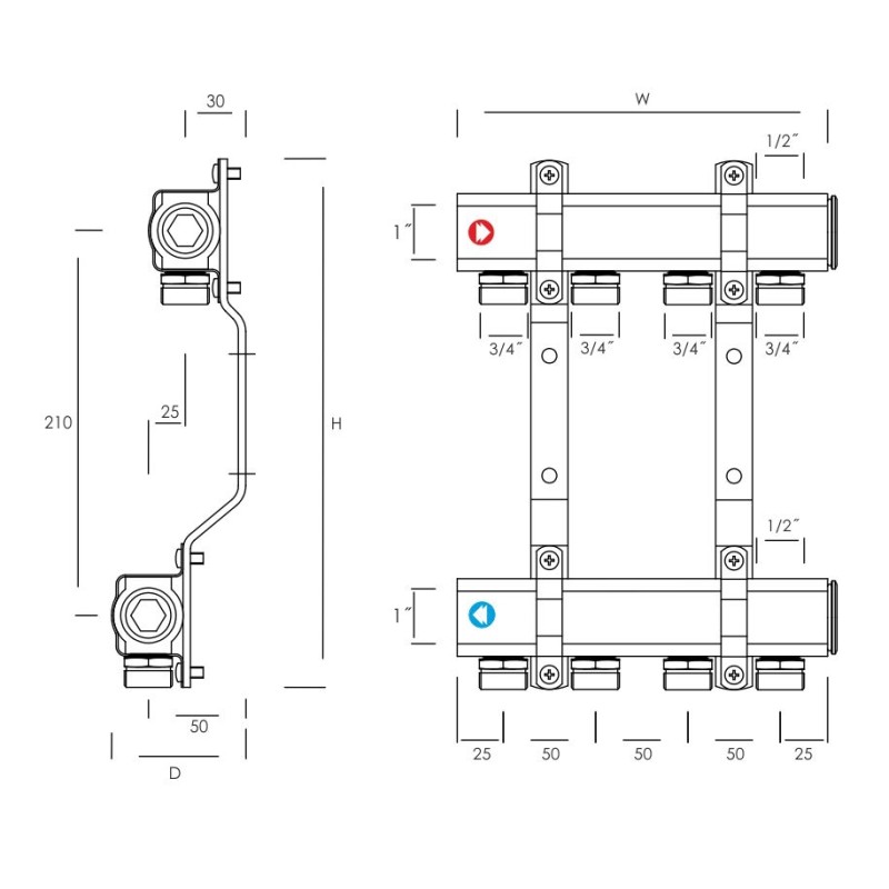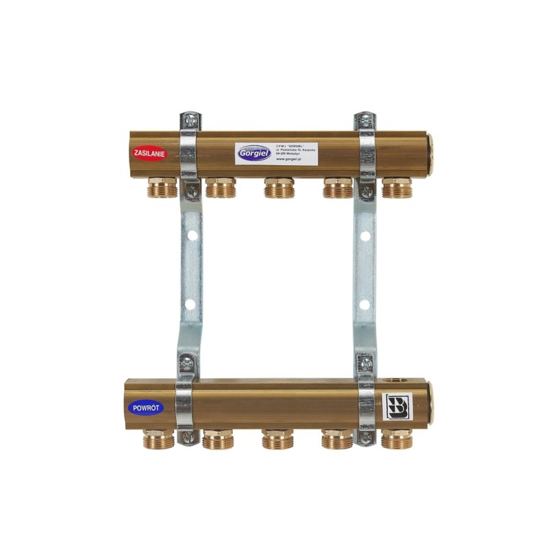 - Belka mosiężna z gwintami 1/2" i 1", nypel redukcyjny 1/2" x 3/4" z uszczelnieniem O-ring, zawieszenia stalowe cynkowane