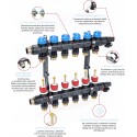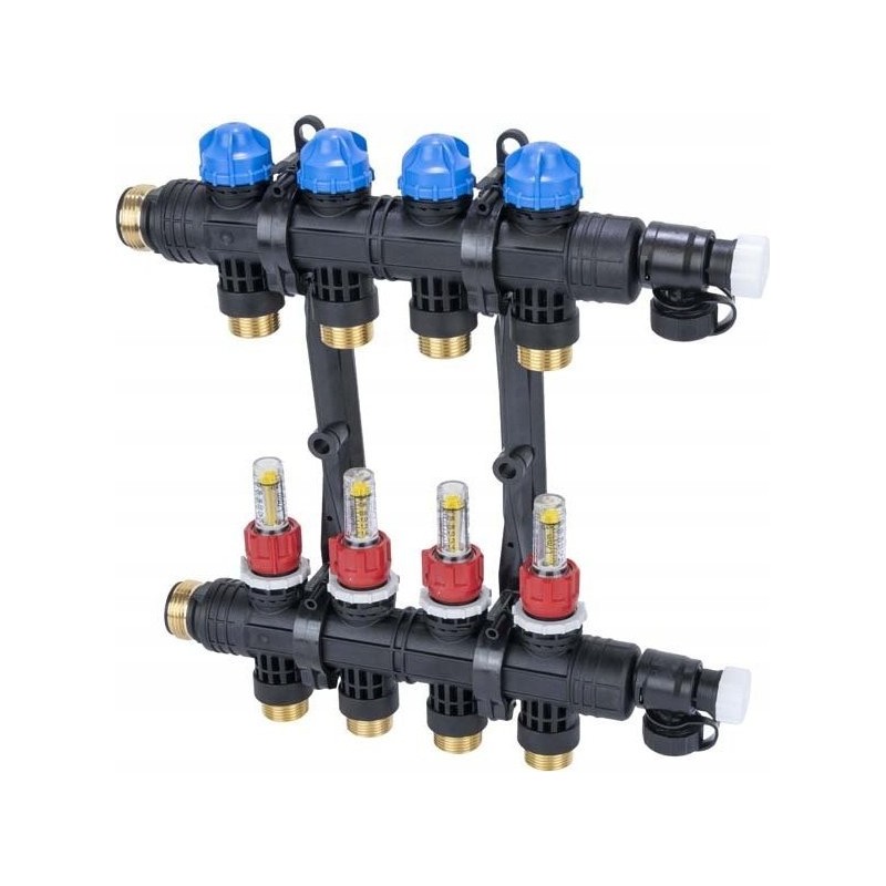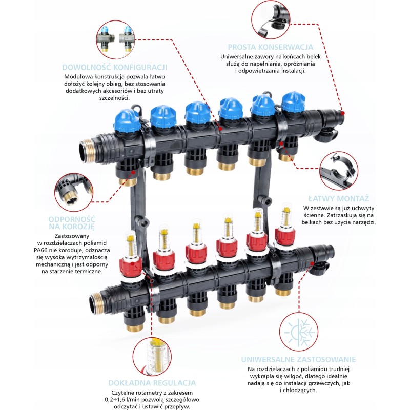 - Belka powrotna wyposażona jest w zawory do ręcznego zamykania obiegów lub montażu siłowników termoelektrycznych.