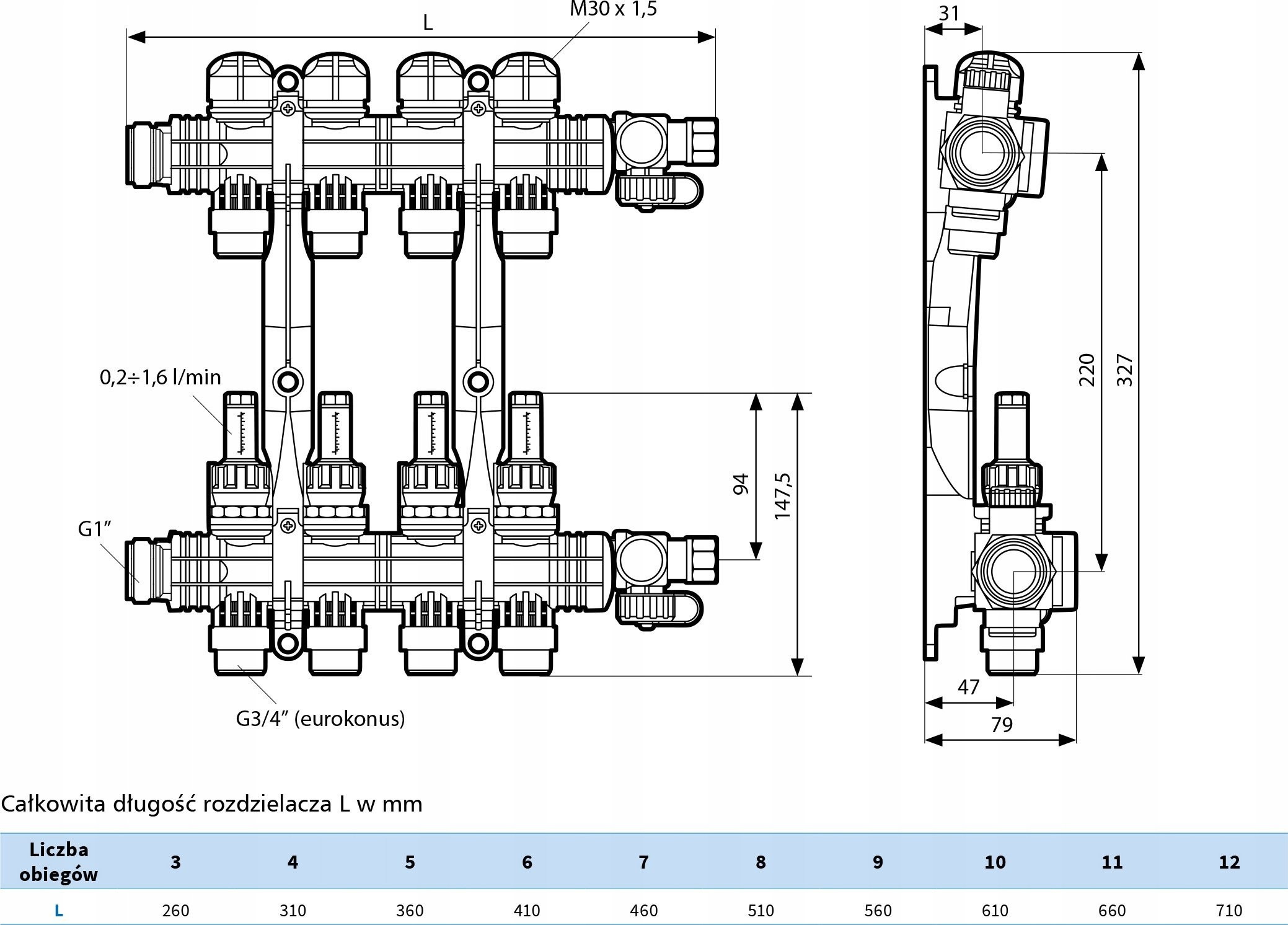 - Rozdzielacz może mieć montowane zasilanie/powrót z prawej lub lewej strony (wystarczy rozdzielacz zdemontować z wieszaków i obrócić).