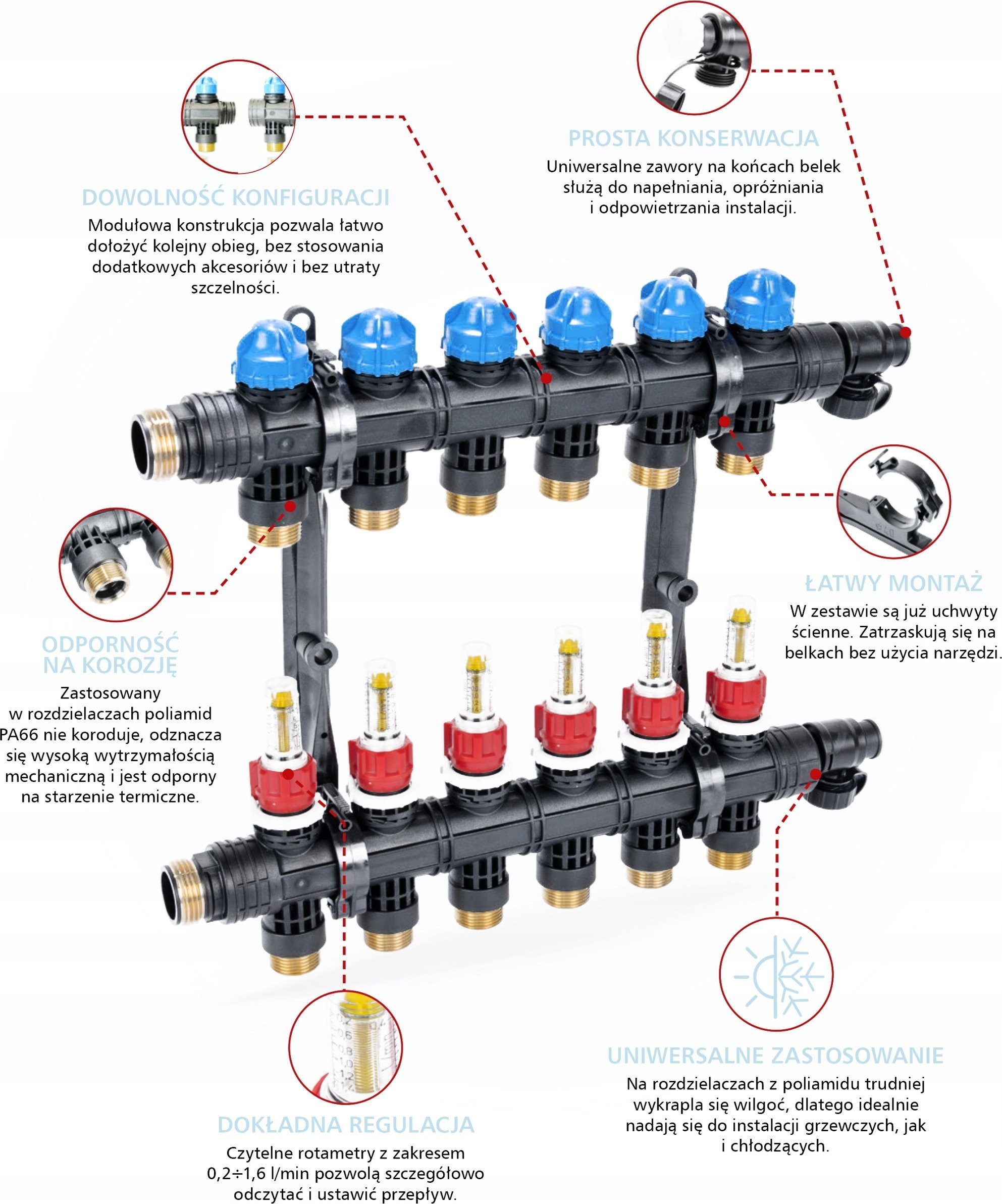 - Z ich pomocą reguluje się ilość ciepła kierowaną do konkretnych pomieszczeń, napełnia, opróżnia oraz odpowietrza instalacje płaszczyznowe.