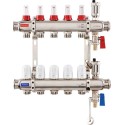 Rozdzielacz ze stali nierdzewnej, liczba obiegów 5, rozdzielacz wyposażony w odpowietrznik zawór spustowy, rotemtery, zawory termostatyczne na belce powrotnej, nyple na belce zasilającej i powrotnej