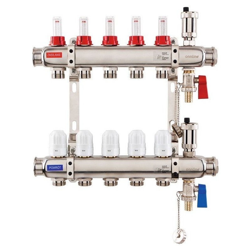 Rozdzielacz ze stali nierdzewnej uzbrojony Onnline INOX (typ K5) liczba obiegów 5