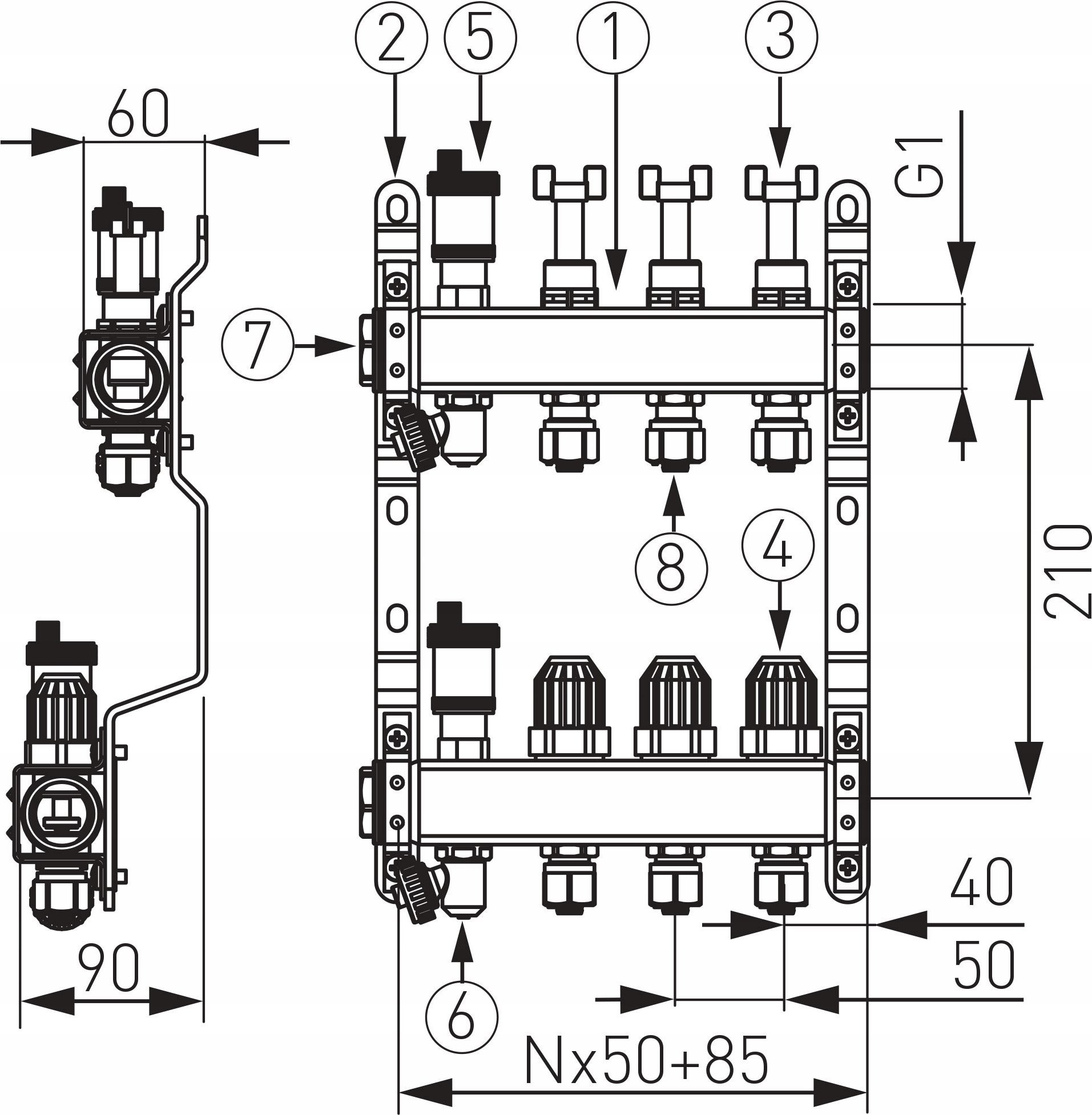 4. zawory termostatyczne na belce powrotnej wyposażone w pokrętła do ręcznej regulacji z możliwością podłączenia głowicy termoelektrycznej (4)