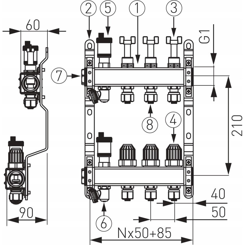 Rozstaw belek rozdzielacza wynosi 210mm, a gwinty przyłączeniowe to 1"