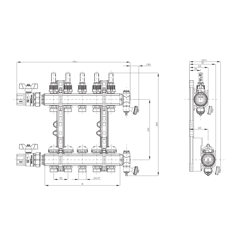 Uwaga: Po zamontowaniu zaworów odpowietrzająco-spustowych i zaworów kulowych szerokość rozdzielacza zwiększy się o 116mm