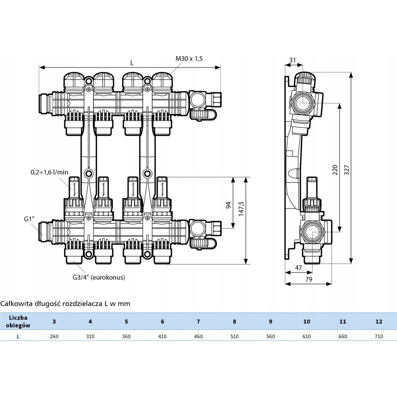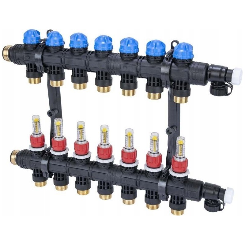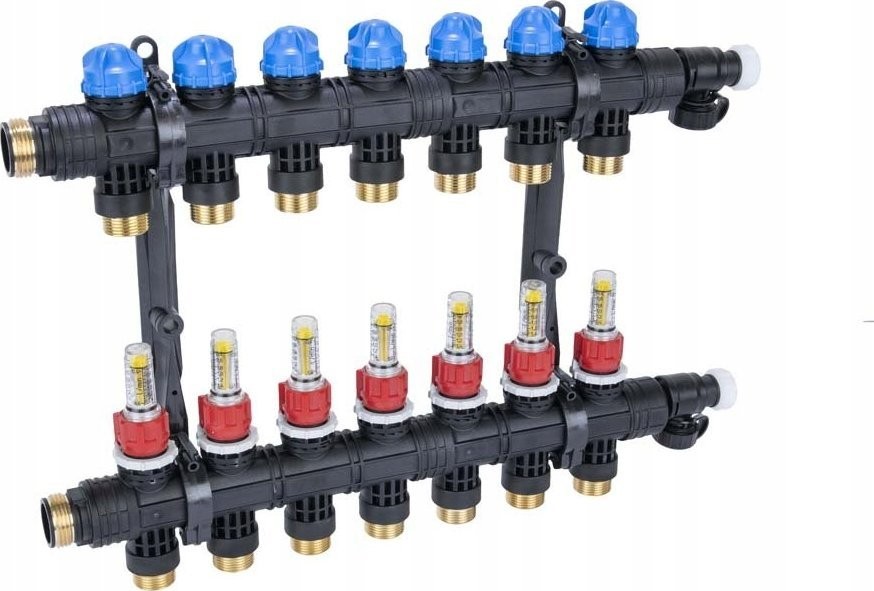 - Belka powrotna wyposażona jest w zawory do ręcznego zamykania obiegów lub montażu siłowników termoelektrycznych.