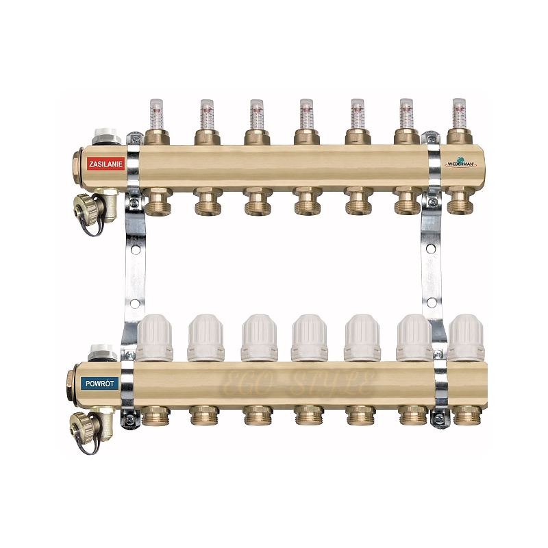 - Zawory termostatyczne na belce powrotnej wyposażone w pokrętła do ręcznej regulacji z możliwością podłączenia głowicy termoelektrycznej (9)