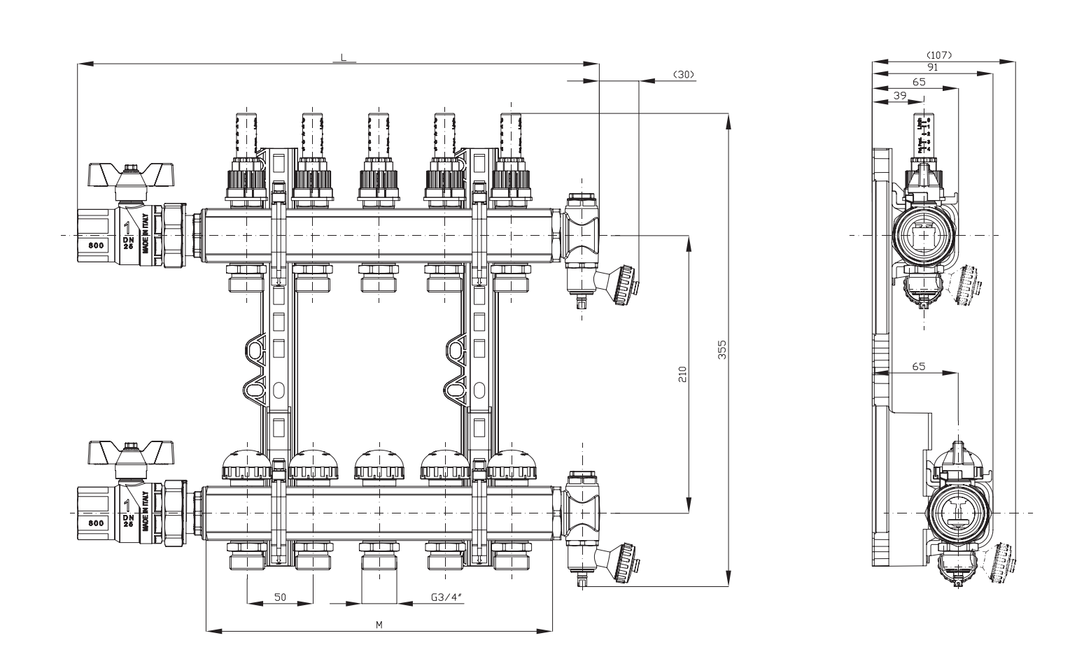 Uwaga: Po zamontowaniu zaworów odpowietrzająco-spustowych i zaworów kulowych szerokość rozdzielacza zwiększy się o 116mm