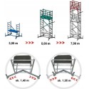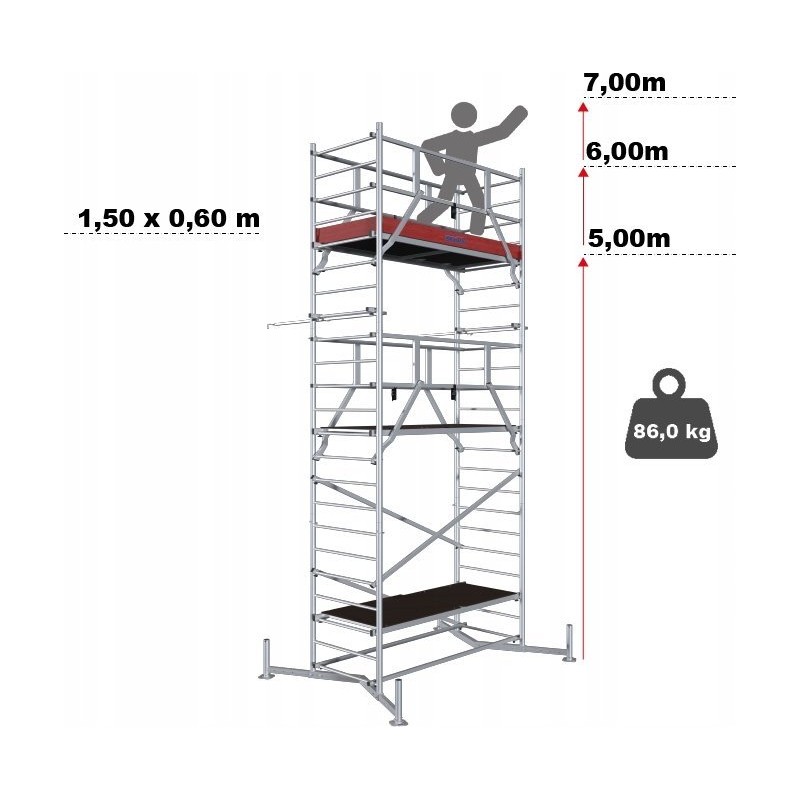 Wysokość do podestu ▸ 5,00m | Wysokość rusztowania ▸ 6,00m | Wysokość robocza ▸ 7,00m | Wymiary podestu ▸ 150 x 60cm