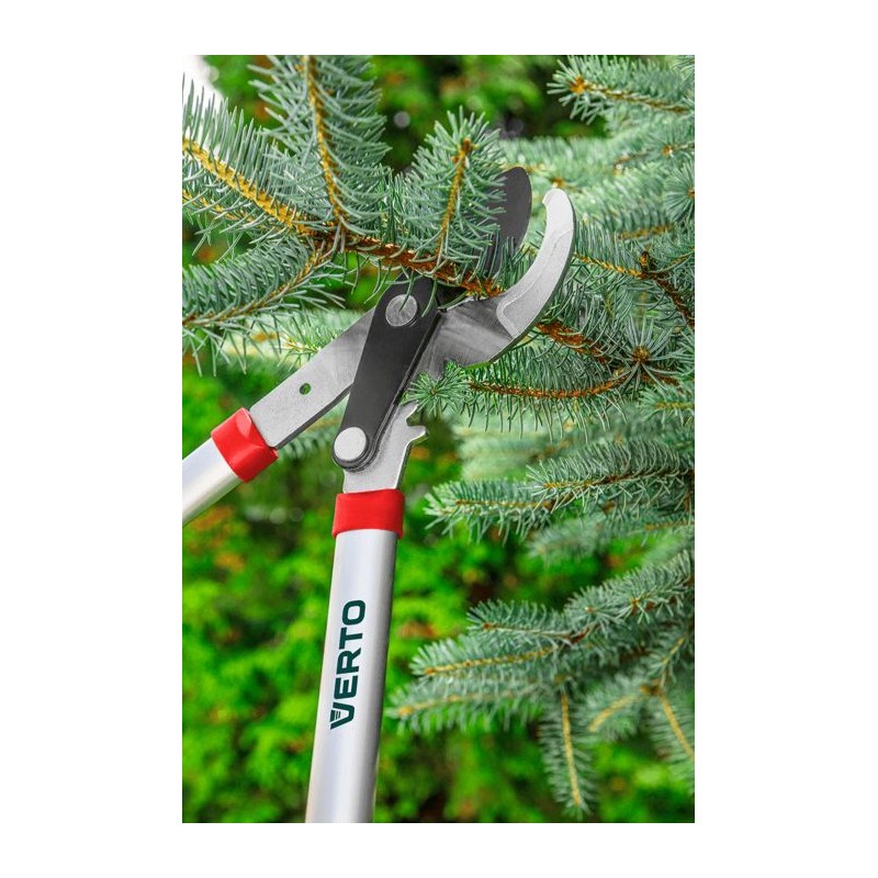Uniwersalny sekator do gałęzi VERTO (nr ref. 15G256) o długości 690 mm i średnicy cięcia do 42 mm. Sekator typu by-pass, przeznaczony do cięcia cienkich i grubych gałęzi. Ostrze pokryte powłoką teflonową, zapewniającą ochronę przed korozją. Dodatkowym atutem jest przekładnia zmniejszająca siłę potrzebną do cięcia o 40% oraz aluminiowe ramiona optymalizujące wagę narzędzia. Uchwyty o ergonomicznym kształcie pokryte antypoślizgowym materiałem zapewniają bezpieczeństwo i komfort podczas użytkowania.