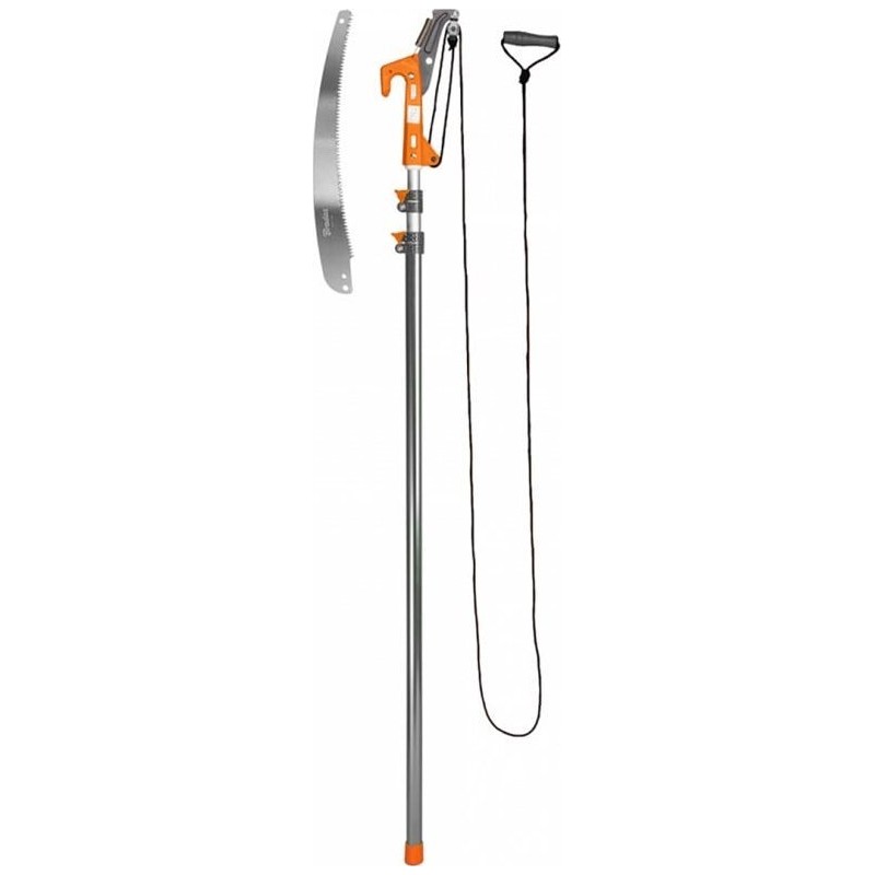 Piła z sekatorem do gałęzi to doskonałe połączenie do prac ogrodowych. Teleskopowy aluminiowy trzonek możemy regulować w zakresie od 155cm do 375cm, pozwalając dosięgać do gałęzi znajdujących się wysoko nad głową. Połączenie piły i sekatora pozwala na cięcie zarówno grubych jak i cienkich gałęzi.