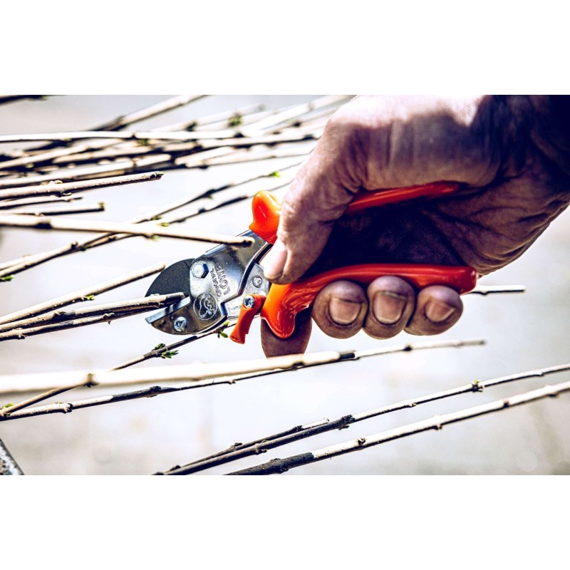 Przeznaczony jest do cięcia zdrewniałych, twardych i suchych gałęzi. Sprawdzi się zatem doskonale podczas zimowych prac porządkowych w ogrodzie. Zbudowany jest dwóch elementów: górnego ostrza tnącego oraz szerokiego kowadełka, na którym opierają się cięte pędy lub gałęzie. Mechanizm kowadełkowy zapewnia mocny chwyt, dzięki któremu cięta gałąź się nie ześlizguje.
