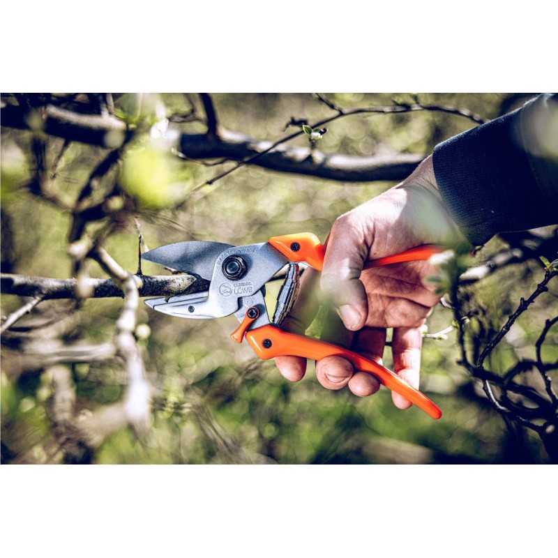 Innowacyjny sekator jednoręczny Lowe 6.107 to uniwersalny profesjonalny mały sekator kowadełkowy, o ergonomicznym kształcie, idealny do cięcia grubych gałęzi, a przy tym wygodny w użyciu. Łączy zalety technologii kowadła i tradycyjnej, dzięki połączeniu geometrii obejściowej i ciągnącego cięcia z dociskiem do nieruchomej podkładki.
