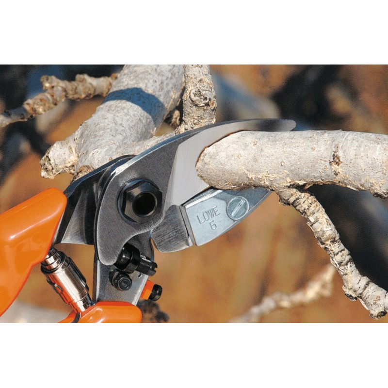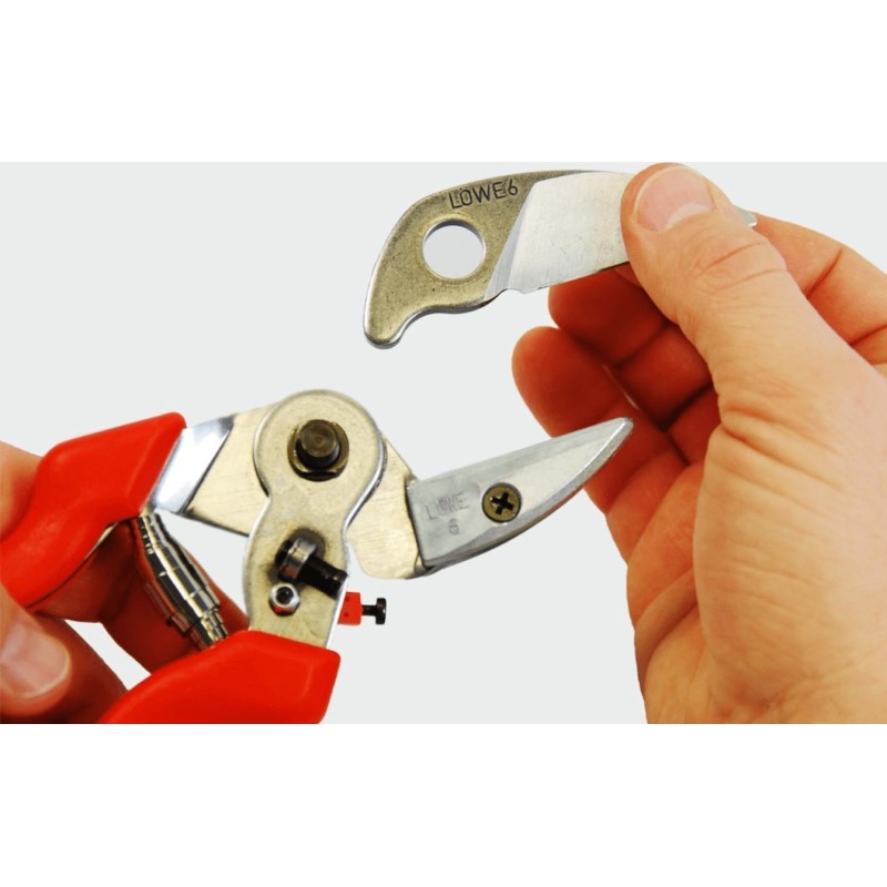 LÖWE 6 jest modelem o ulepszonej technice cięcia. Zewnętrzne ostrze można łatwo i szybko wymienić, dzięki temu, że jest zamocowane wyłącznie za pomocą jednej śruby. Już nie trzeba demontować całego sekatora.