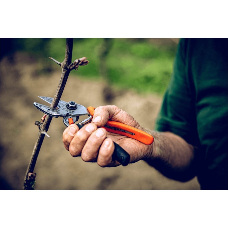 - Rozmiar i kształt sekatora sprawia, ze może być używany przez osoby ze średnią jak i dużą dłonią. Idealnie leży w dłoni użytkownika, dzięki ergonomicznym kształcie rękojeści z powłoką antypoślizgową,