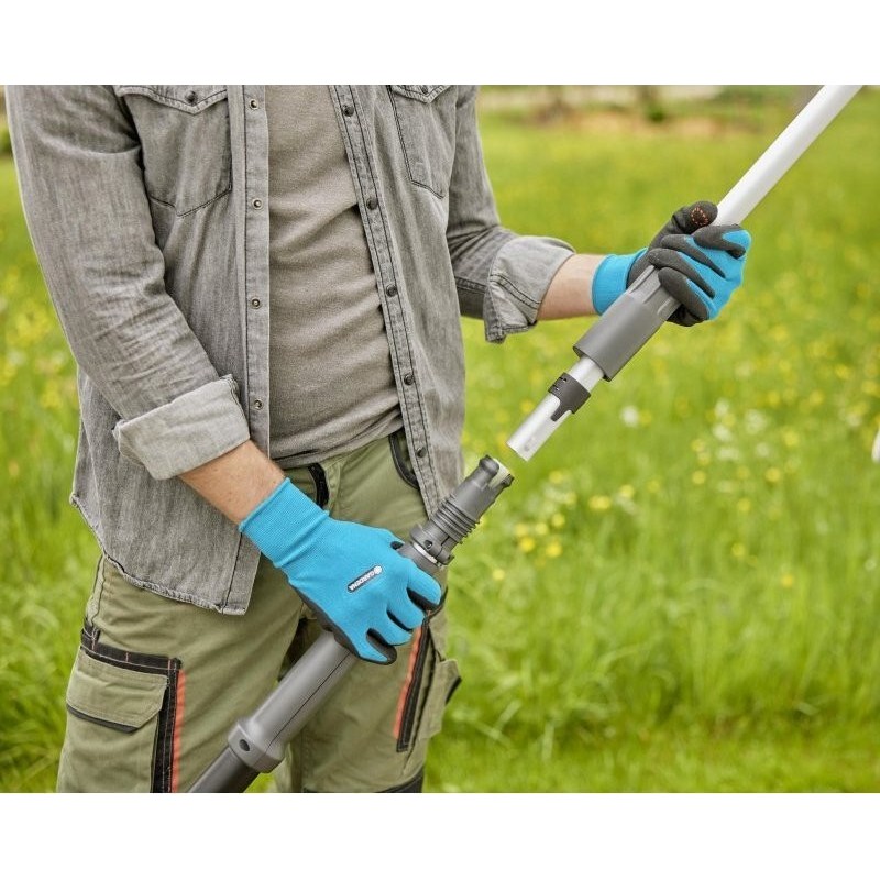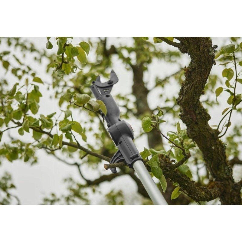 HighCut można wygodnie transportować i przechowywać dzięki dwuczęściowemu wałowi. Akumulator POWER FOR ALL sprawia, że cięcie jest proste, bez dużego zapotrzebowania na energię. Oryginalne ostrza GARDENA, produkowane w Niemczech z hartowanej stali, zapewniają czyste, płynne cięcie świeżych gałęzi o średnicy do 28 mm. Są pokryte nieprzywierającą powłoką i precyzyjnie szlifowane, dzięki czemu cięte gałęzie nie przyklejają się do ostrza. Smukła, obrotowa głowica tnąca pozwala na cięcie gałęzi pod kątem 60 stopni. Ponadto głowica ustawiona pod kątem zapewnia dobre pole widzenia. W przypadku, gdy gałąź zostanie na drzewie, można ją ściągnąć za pomocą haka umieszczonego na końcu trzonka. Wskaźnik LED na ergonomicznym trzonku pokazuje stan naładowania akumulatora. Można użyć dowolnego akumulatora POWER FOR ALL. POWER FOR ALL ALLIANCE to jeden z największych sojuszów strategicznych wiodących producentów produktów akumulatorowych. Akumulatory z tej serii mogą być używane w wielu różnych urządzeniach do domu i ogrodu. W ten sposób oszczędzasz pieniądze i zachowujesz pełnię możliwości! nr 14776-20). GARDENA – napędza nas pasja. JEDEN system akumulatorowy do wszystkich zadań w ogrodzie.