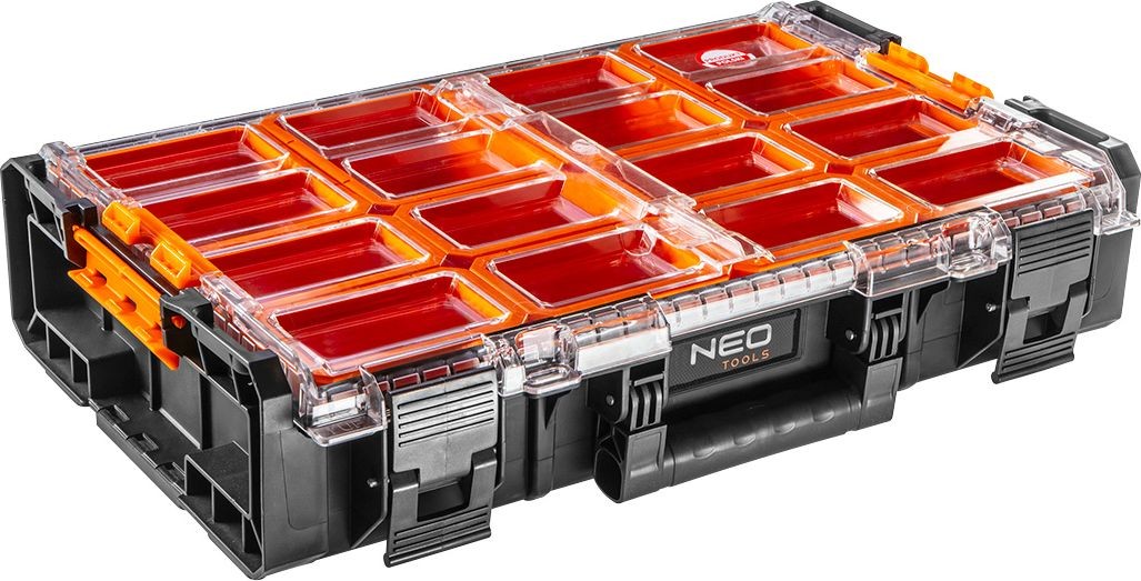 Organizer modułowy NEO (nr.ref 84-268) to mocna skrzynia do przenoszenia i magazynowania akcesoriów takich jak śruby, nakrętki czy kołki. Zawiera cztery duże i osiem średnich pojemników, do których użytkownik ma łatwy dostęp. Pojemniki są wyjmowane co ułatwia pracę. Wyprofilowana pokrywa utrzymuje każdy pojemnik na swoim miejscu zapobiegając ich przesuwaniu jak i przemieszczaniu się zawartości między pojemnikami. Organizer posiada jednolitą uszczelkę. która zapewnia wodoszczelność. Mocny polipropylenowy korpus, poliamidowe zapięcia i konektora wraz z poliwęglanową pokrywą stanowią bardzo mocną i trwałą konstrukcję przeznaczoną do najtrudniejszych warunków panujących na budowie. Marka NEO spełnia oczekiwania profesjonalistów.