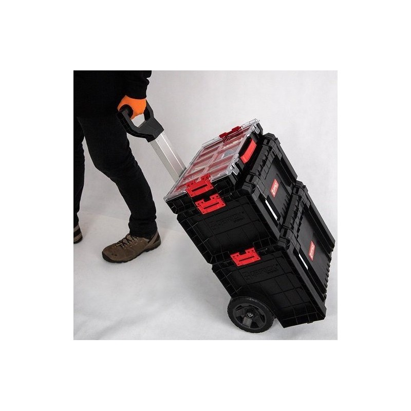 Wózek transportowy na narzędzia PRO Organizer 100 + RRO Toolbox + PRO CartQbrick System PRO to nowa generacja kompaktowych skrzynek narzędziowych z innowacyjnym podejściem do ergonomii pracy. Unikalna w tej klasie funkcja łączenia skrzynek ze sobą za pomocą poliamidowych łączników umożliwia bezpieczną obsługę. Ten uniwersalny zestaw mobilny nadaje się zarówno do przenoszenia, jak i transportu różnych narzędzi. Mobilny wózek warsztatowy może być używany wszędzie tam, gdzie jest potrzebny dzięki dwóm dużym kołom i teleskopowemu uchwytowi. | |