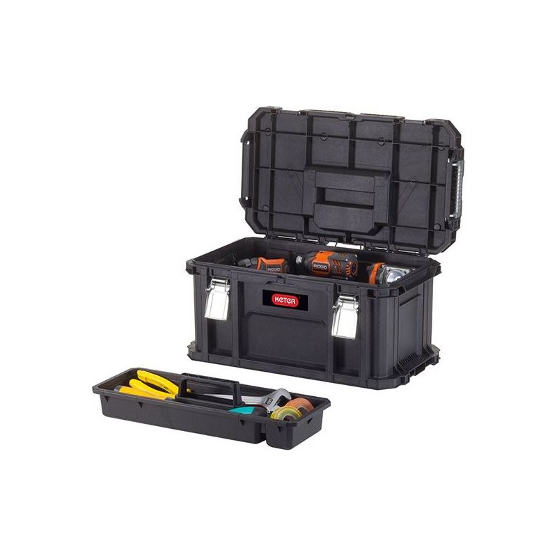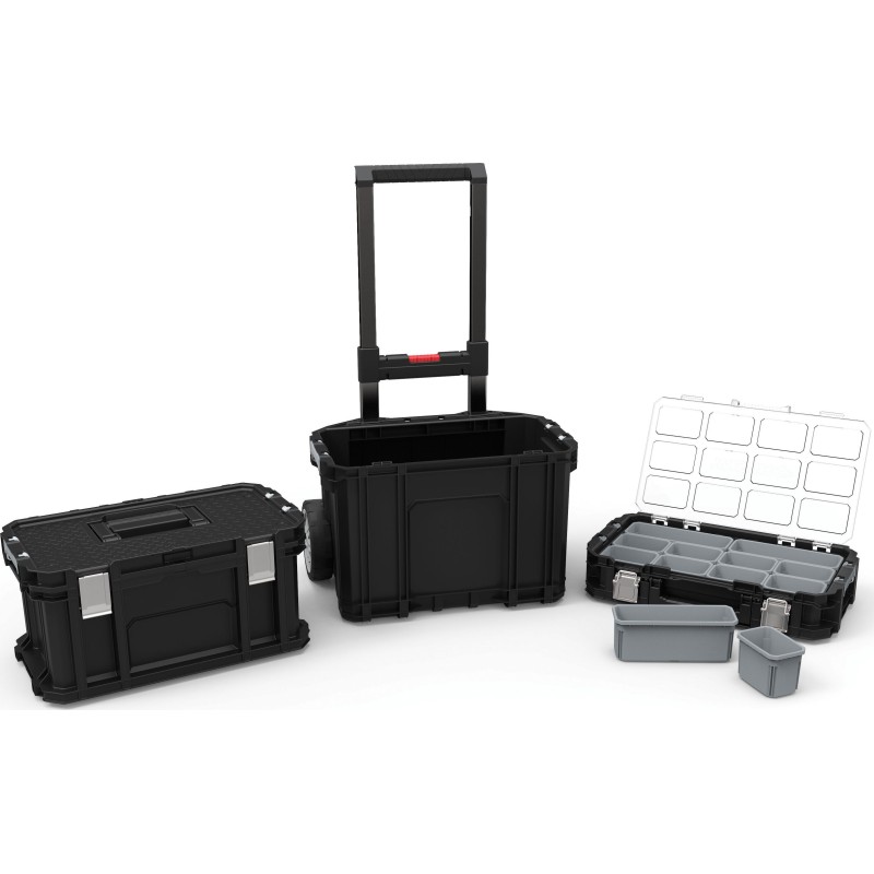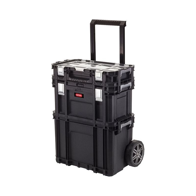 - Każdy z modułów może być dodatkowo używany samodzielnie. W skłąd zestawu wchodzą: duży, pojemny i wytrzymały segment dolny, pełniący funkcję wózka – idealny do ciężkich narzędzi i materiałów; segment środkowy będący pojemną skrzynką narzędziową z wyjmowaną tacką; segment górny – poręczny organizer z wieloma wyjmowanymi przegródkami-pojemnikami z przezroczystą pokrywą.