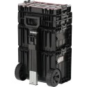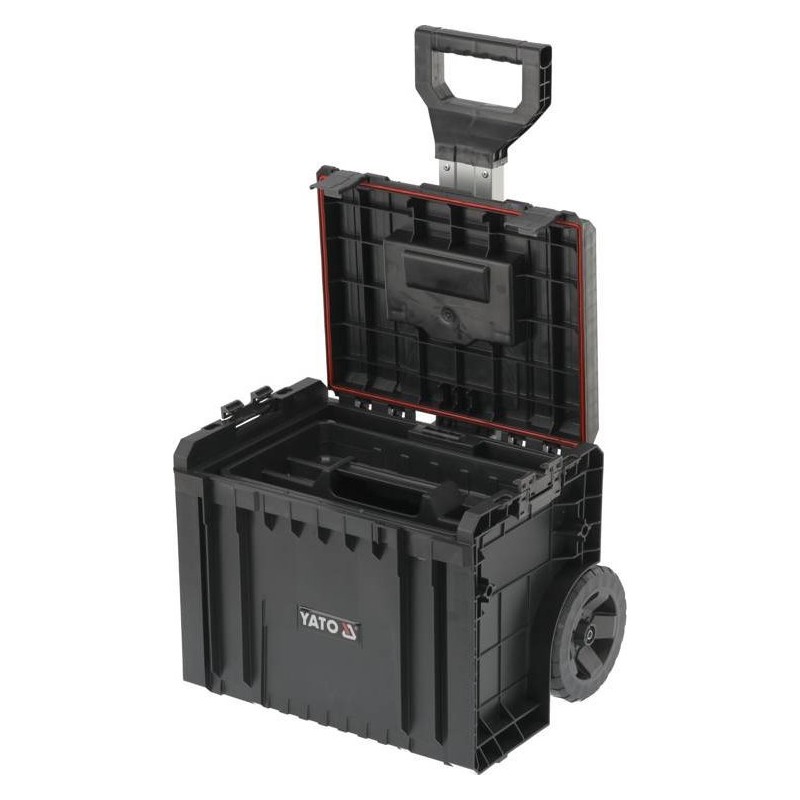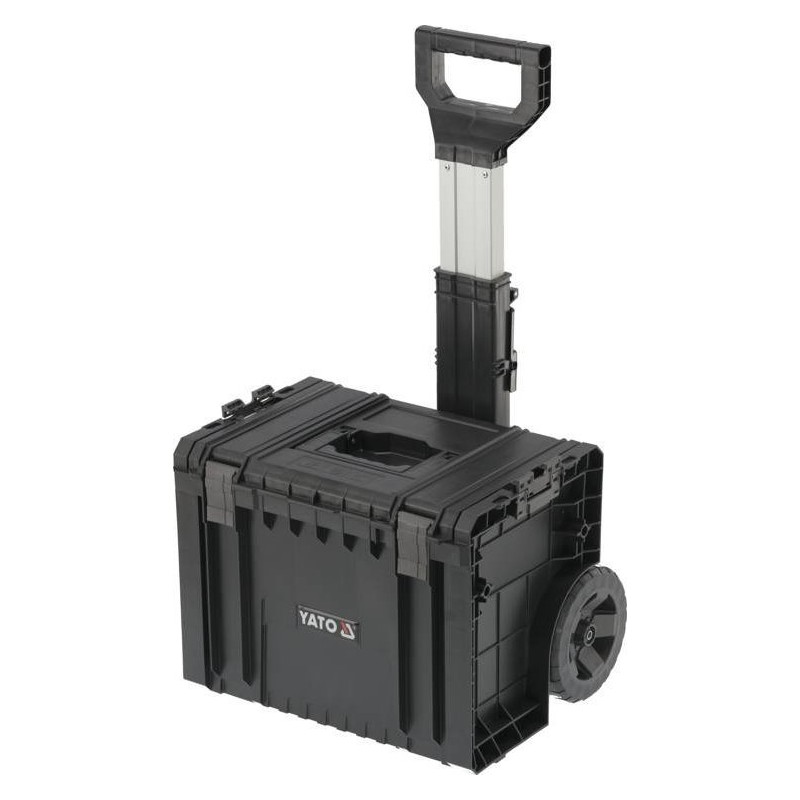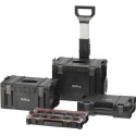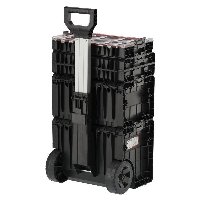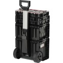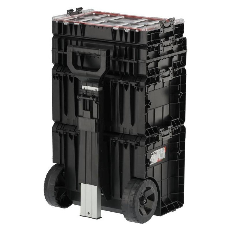 Całość to 4 elementowy mobilny zestaw na kołach z teleskopowym uchwytem, posiada duże koła pokryte gumą zamontowane na metalowej osi. Dodatkowo, o bezpieczeństwo transportowanych narzędzi dbają również solidne zapięcia i konektory boczne wykonane z mocnego poliamidu. Elastyczne uszczelki zamontowane w pokrywach zapewniają bryzgoszczelność, co chroni zawartość przed zachlapaniem oraz zapyleniem.