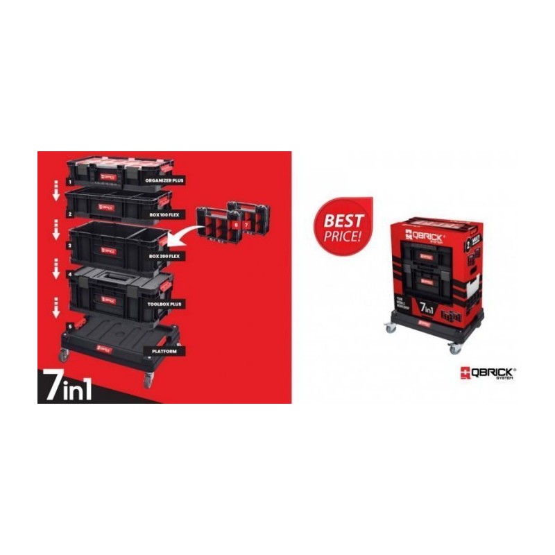 Zestaw skrzynek QBRICK SYSTEM TWO 7w1w skład zestawu wchodzą:- platforma transportowa QBRICK- skrzynia TOOLBOX PLUS- skrzynia BOX 200 FLEX + 2 organizery w środku- Skrzynia BOX 100 FLEX- organizer PLUS...