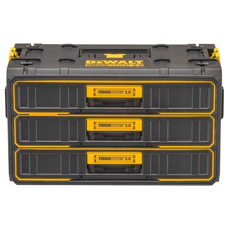 Profesjonalna i wytrzymała skrzynia na narzędzia DeWALT DWST08330-1 z serii ToughSystem 2.0. Posiada trzy szuflady do przechowywania i transportowania elektronarzędzi oraz akcesoriów. Zmieniona konstrukcja bocznych zatrzasków sprawia, że są one intuicyjne i łatwe w użyciu, co przyczynia się do oszczędności czasu. Po dołożeniu dodatkowego modułu, zatrzaski zamykają się automatycznie po lekkim naciśnięciu przykładanego skrzyni. System bocznych zatrzasków umożliwia łączenie skrzyń i wózków systemu ToughSystem 2.0 oraz ToughSystem 1.0 DeWALT w różnych konfiguracjach, dostosowanych do indywidualnych potrzeb użytkownika.