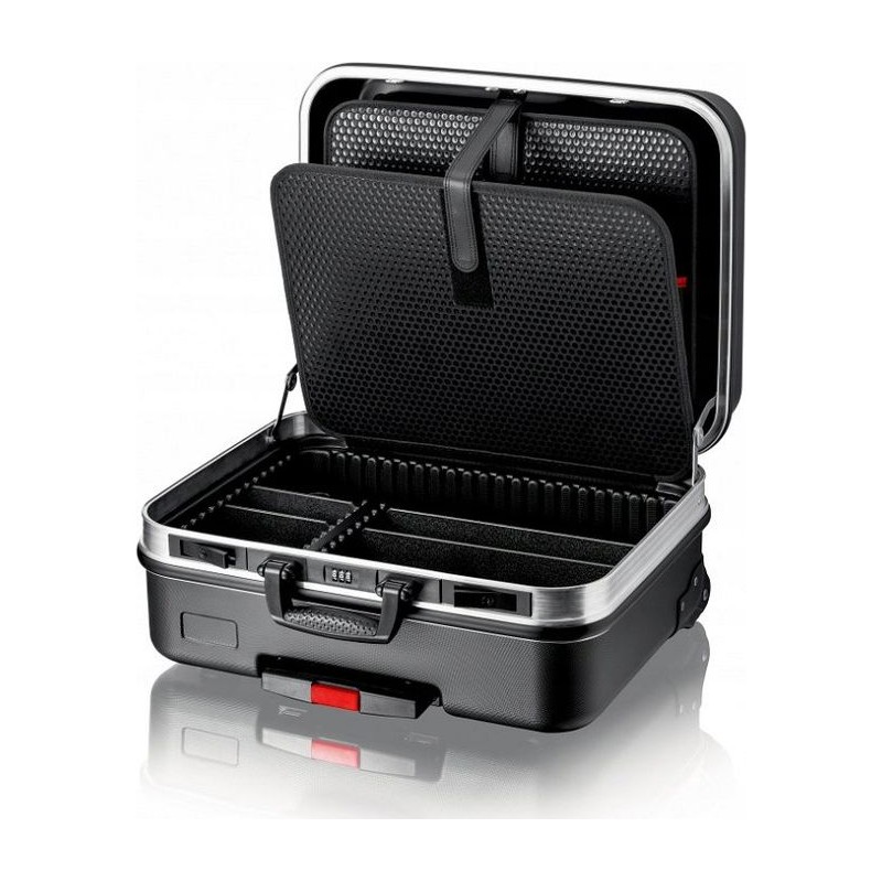 - Dno, które można mocować przyciskiem, o wysokości 70 mm, możliwe do podziału za pomocą wkładek; płyta pokrywy z 13 dużymi kieszeniami na narzędzia oraz przedziałem płaskim