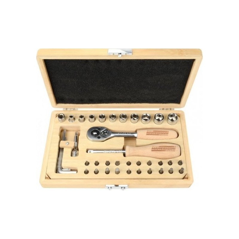 Zestaw nasadek Brüder Mannesmann oferuje optymalny komplet narzędzi w trwałej, starannie wykończonej, bambusowej walizce.