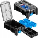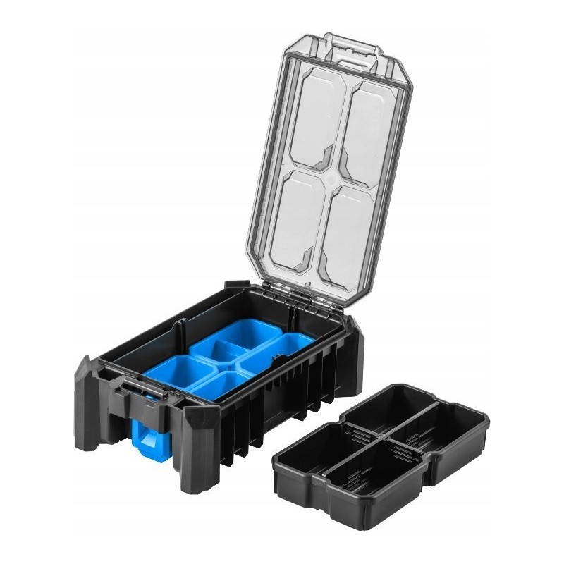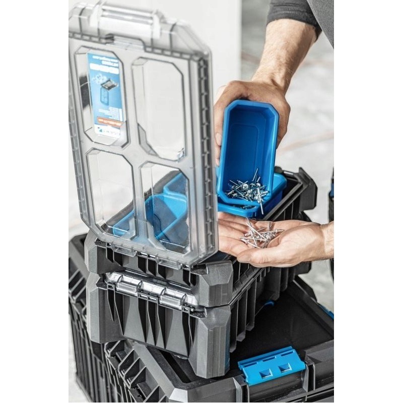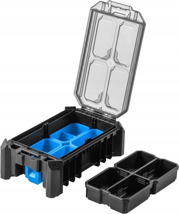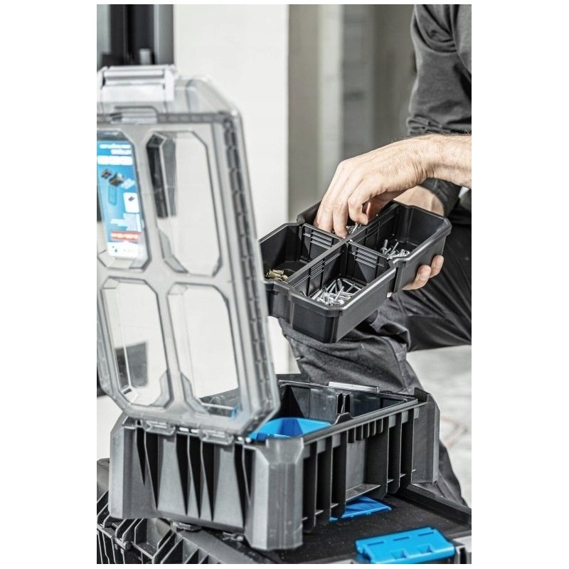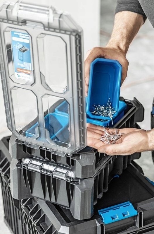 Wyposażona w 5 funkcjonalnych pojemniczków, w tym 4 pojemniczki tej samej wielkości oraz 1 większy pojemniczek z 3 przegrodami, ta skrzynka pozwala na precyzyjne uporządkowanie małych narzędzi, akcesoriów i innych drobnych przedmiotów. To sprawia, że przechowywanie i transportowanie niezbędnych akcesoriów staje się łatwiejsze i bardziej przejrzyste.
