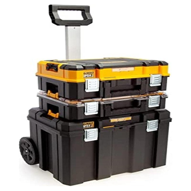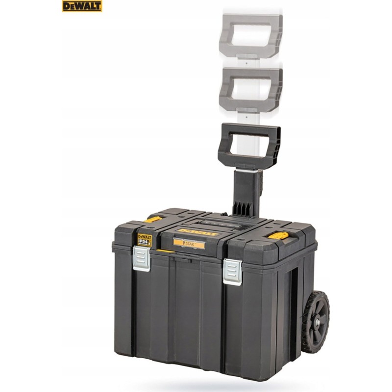 Mobilny moduł skrzyń TSTAK, walizka systemowa na kółkach marki DeWalt, wykonana z tworzywa o wysokiej wytrzymałości (IP54).
