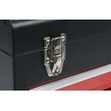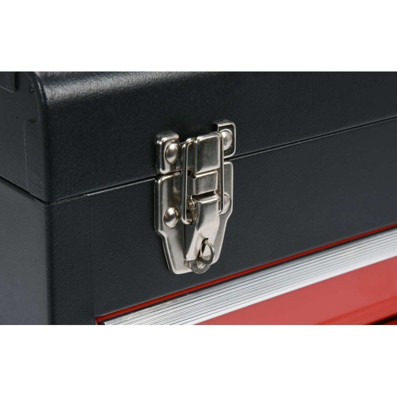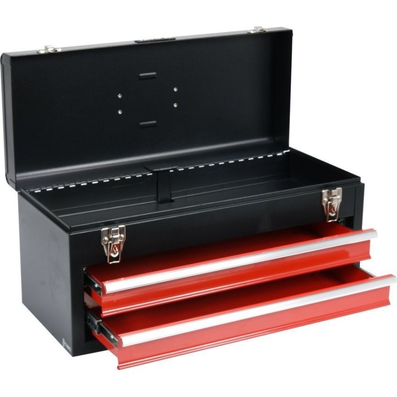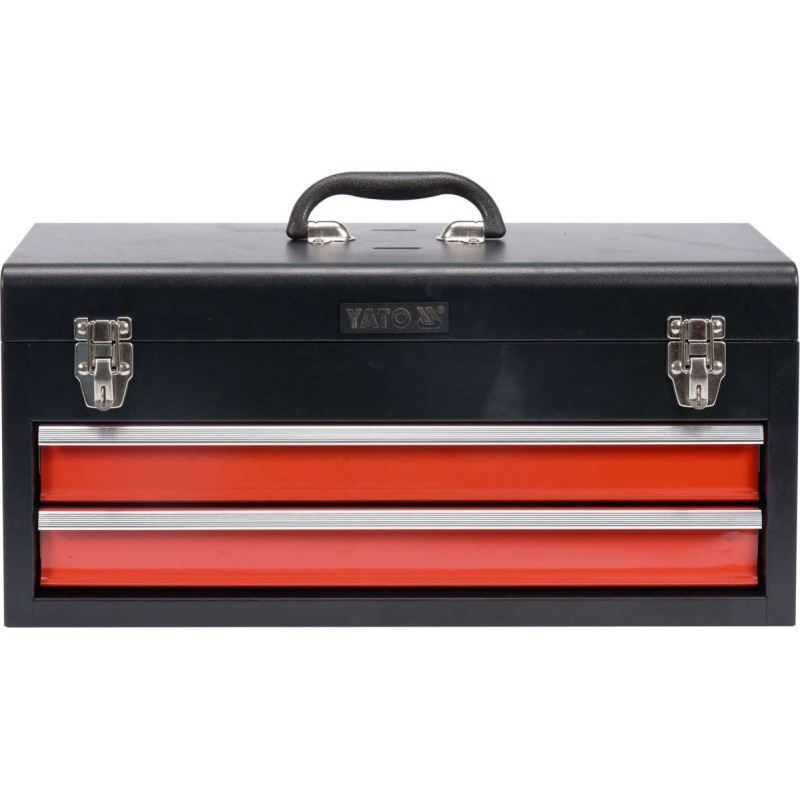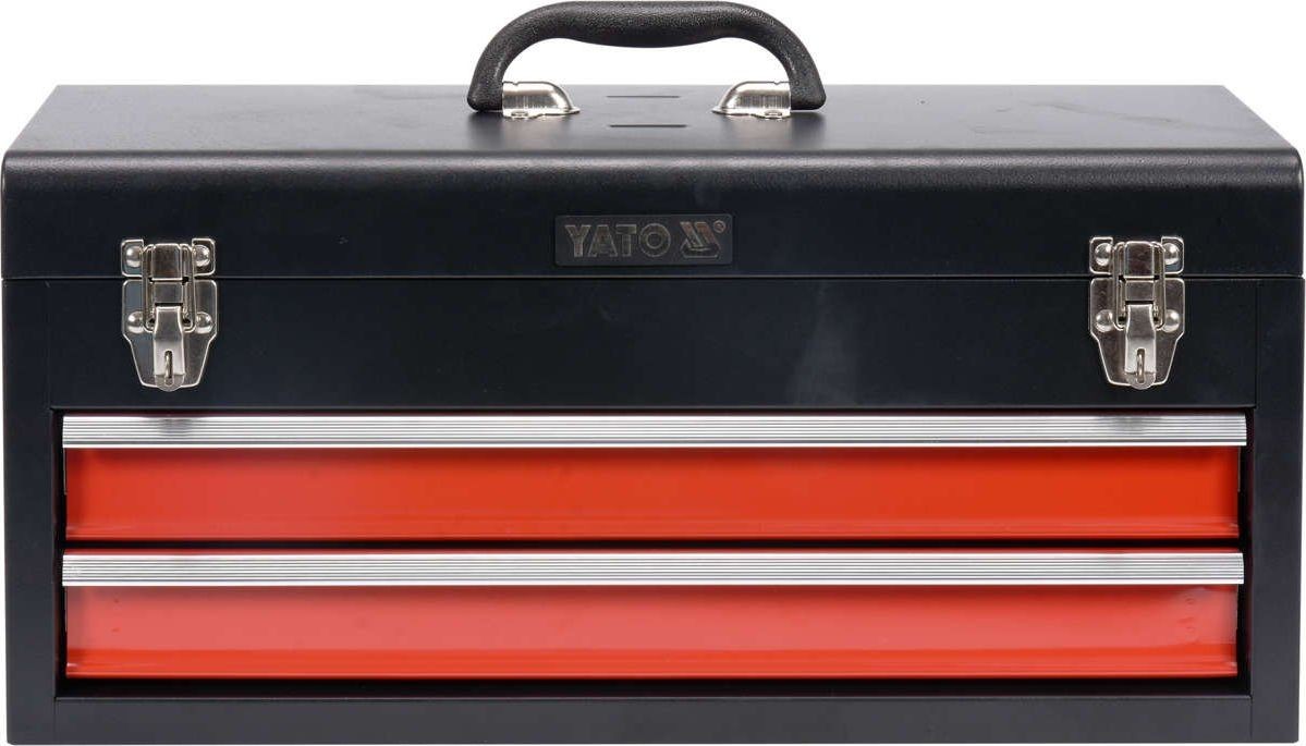 Skrzynka YATO na ręczne narzędzia warsztatowe wyposażone w szuflady zamontowane na metalowych prowadnicach kulkowych. Posiadają dodatkowy schowek górny zamykany metalowymi zatrzaskami.